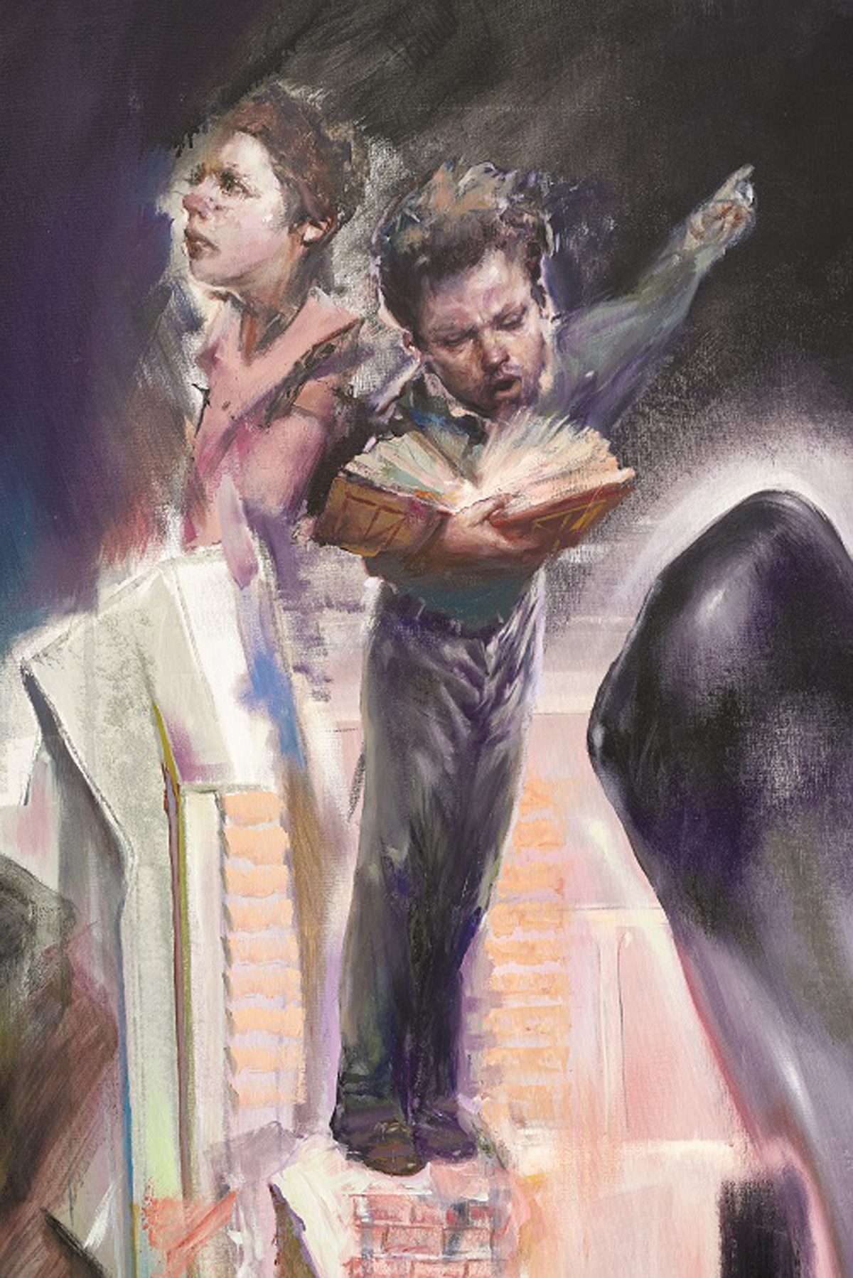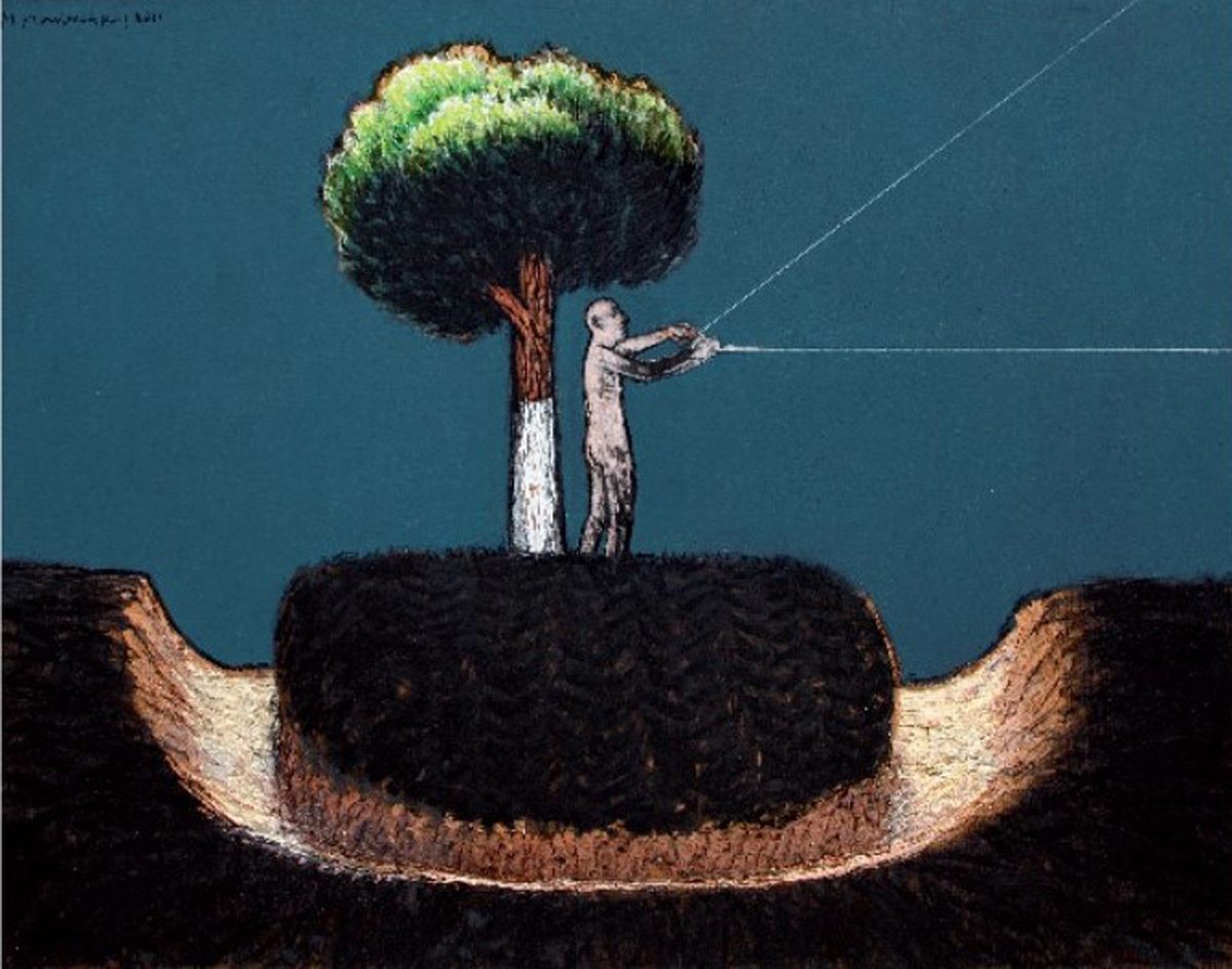 Όπως δηλώνει ο Μ. Μανουσάκης για το έργο του: «Οι πρωταγωνιστές στις ζωγραφιές μου μοιάζουν με τους ξενύχτηδες που προσπαθούν ζαλισμένοι να συναρμολογήσουν τα σπαράγματα της μέρας τους ή να αναδυθούν λυτρωμένοι από την αγωνία για τα μελλούμενα».
