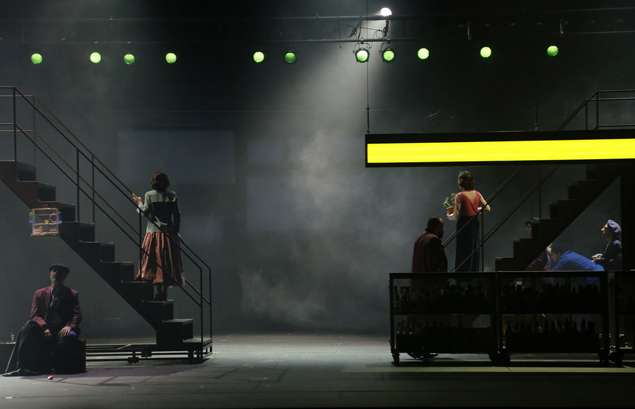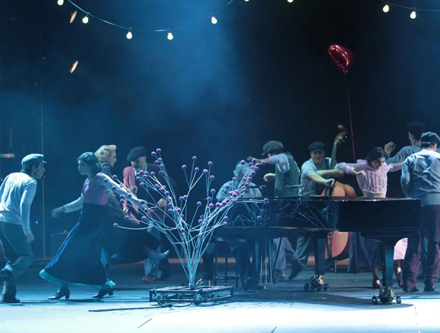 Είναι όντως πολύ δύσκολο να γίνει. Όπως καταλαβαίνετε, ο καθένας είχε τη δική του προσέγγιση. Έπρεπε λοιπόν να εφεύρουμε εξ’ αρχής μία κοινή γλώσσα επικοινωνίας, που δεν θα ήταν τα λόγια –κοινή παραδοχή σε όλους- αλλά μία νέα σκηνική γλώσσα, ομοιογενή. Αυτό που κάνουμε στην «Μισαλλοδοξία» έχει μεγάλη σχέση και με τον χορό, μία τέχνη δηλαδή που επικοινωνεί πράγματα χωρίς να χρειάζονται λόγια. Η παράστασή μας βασίζεται ταυτόχρονα σε πολλούς κώδικες: της κίνησης –της σκηνικής δράσης δηλαδή των ηθοποιών-, της μουσικής η οποία είναι ζωντανή με τέσσερις μουσικούς επί σκηνής, και με την συνδρομή –όπου αυτό είναι αναγκαίο και συμπληρωματικό- γραπτού κειμένου, σε μορφή υπερτίτλων. Κι αυτό επίσης είναι μία αναφορά στον βωβό κινηματογράφο, που χρησιμοποιούσε μεσότιτλους όταν ήταν απαραίτητο για να μεταδώσει πληροφορίες οι οποίες δεν περνούσαν μόνο από την εικόνα. Χρησιμοποιήσαμε λοιπόν και αυτό το μέσο. Επομένως, αυτό που μεταφέρεται στον θεατή είναι ένας συνδυασμός πολλών πραγμάτων, η αφήγηση συντίθεται από πολλά επίπεδα, από πολλές «γλώσσες».