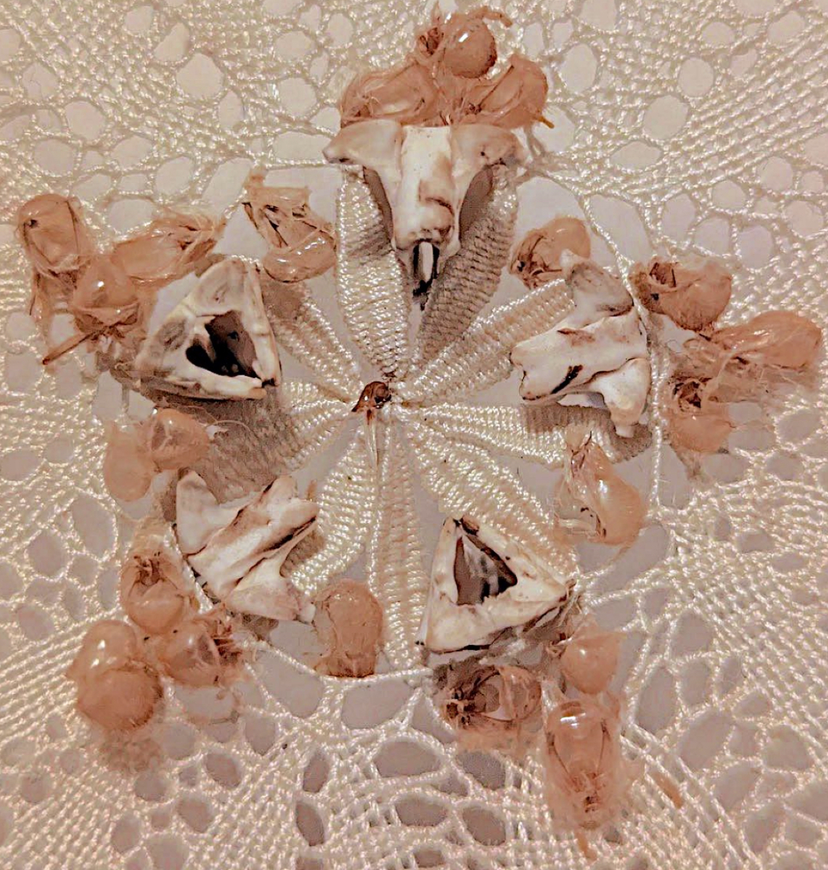 Όλα τα παραπάνω φυσικά στοιχεία υπάρχουν σε απτή μορφή και στα μικρο-περιβάλλοντα που “χτίζει” μέσα σε plexiglass, με την προσθήκη όμως ενός νέου, ανθρώπινα κατασκευασμένου υλικού. Πρόκειται για χειροποίητες δαντέλες φτιαγμένες από την ίδια με κοπανέλι, μια παραδοσιακή τεχνική που τείνει να χαθεί και της οποίας τα μοτίβα είναι εμπνευσμένα από το ελληνικό τοπίο. Ισχύει δηλαδή και στην παράδοση του κοπανελιού το ίδιο που συμβαίνει και με τα έργα της Μαυροκεφάλου∙ η συμμετρία της φύσης μετουσιώνεται σε μια προσωπική, σύγχρονη ανθρώπινη δημιουργία. Στη δική της περίπτωση βέβαια, τα νήματα του κοπανελιού μπλέκουν με θραύσματα που μαζεύει η ίδια από τον φυσικό κόσμο: πουκάμισα τζιτζικιών, κουκούτσια από μανταρίνια, ακίδες αχινών.