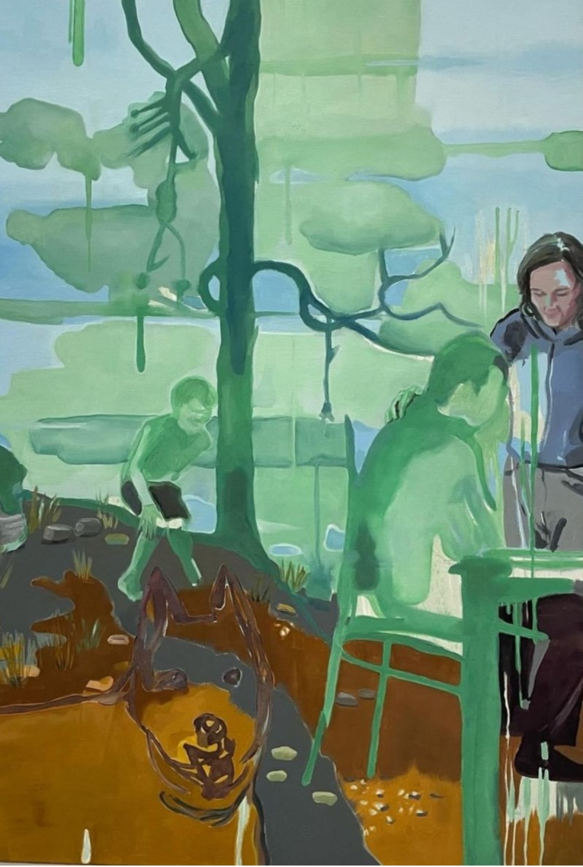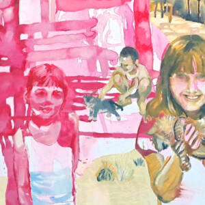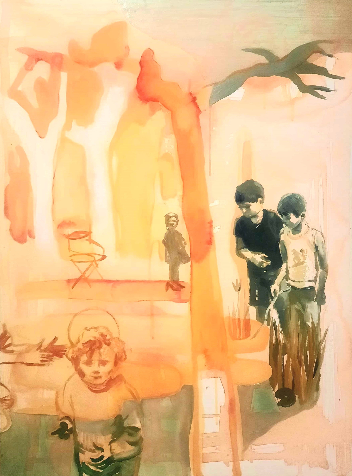 Ταυτόχρονα, η μονοχρωματική επιφάνεια διακόπτεται ή συμπληρώνεται καίρια από κάποιο διαφορετικό χρωματικά ένθετο σώμα, σχεδιασμένο με λεπτομερή ενδελέχεια: το ίδιο γνώριμο αγόρι σε αλληλουχία και σε διαφορετικές ηλικίες στον ίδιο καμβά και μαζί οι φίλοι του, κορίτσια και γυναικείες φιγούρες που ταυτίζονται άλλοτε με τον στενό προσωπικό κύκλο της ζωγράφου και που άλλοτε προέρχονται από τους θησαυρισμένους φωτογραφικούς παιδικούς κόσμους της Shirley Baker ή τις αναγνωρίσιμες ασπρόμαυρες αιχμηρές παρουσίες του Cartier Bresson.