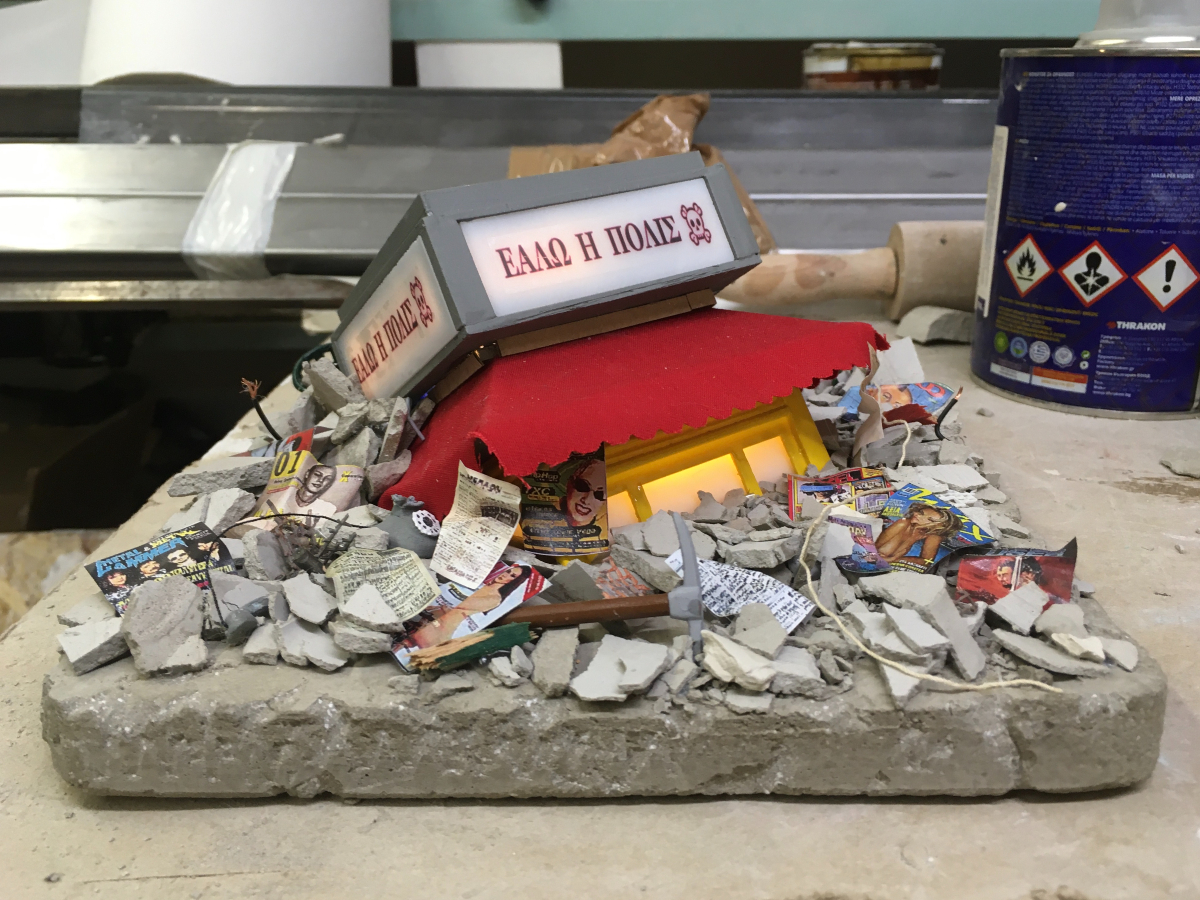 Εκτός από τις κλασσικές μινιατούρες, παρουσιάζονται και κάποιες σουρεαλιστικές προσεγγίσεις με παράλληλες πραγματικότητες να «εγκλωβίζονται» μέσα σε περίπτερα, καθώς και αφαιρετικές κατασκευές βασισμένες στα νεοκλασσικά στοιχεία των Αθηναϊκών περιπτέρων.