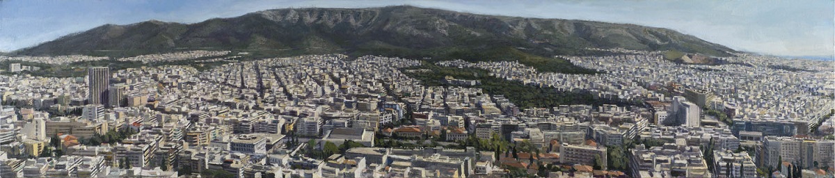 Το νόημα του τίτλου «Πέρα από το μπετόν» αποδίδει επακριβώς το πνεύμα των έργων του Αντώνη Σκαμπαβίρια, καθώς ο ζωγράφος παρουσιάζει 25 λάδια συνοδευμένα από αριθμό μελετών τους σε ακουαρέλα και μολύβι, όλα με θέμα τους το σκληρό αστικό τοπίο της Αθήνας, του Πειραιά και των πέριξ προαστίων. Ο Σκαμπαβίριας όμως, χάρη στη ζωγραφική, εξανθρωπίζει την, συνήθως, σκυθρωπή όψη της μεγαλούπολης και φέρνει στην επιφάνεια την ιδιαίτερη ποιητική του Άστεως, με τον ίδιο τρόπο που το κάνει ο Μπωντλαίρ για το Παρίσι του δέκατου ένατου αιώνα. Εμπνέεται ελάχιστα από την ιστορία και καθόλου από τη γραφικότητα, αλλά ανακαλύπτει το κάλλος και τη μυστηριώδη γοητεία του χαώδους αστικού ιστού, και προσπαθεί να βάλει σε ζωγραφική τάξη τον οπτικό ερειπιώνα της σύγχρονης Αθήνας. Καταφέρνει έτσι να την αναβιβάσει από κακιά μάνα σε καλή μητριά και την προσφωνεί με τον χρωστήρα του όπως ο Ποιητής: «Σ’αγαπώ, κακόφημη πρωτεύουσα!». Για να το καταφέρει αυτό, καταφεύγει στη γεωμέτρηση του τοπίου – και έτσι ο Σκαμπαβίριας εντάσσεται τελευταίος κρίκος σε μια γενεαλογία μαθητείας: Χατζηκυριάκος-Γκίκας, Τέτσης, Ρόρρης.
