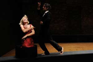 Αντώνης Μυριαγκός: Πρώτα από όλα θα ήθελα να πω πως η παράσταση καταπιάνεται ουσιαστικά με την κατάσταση που ζει σήμερα ο άνθρωπος. Το αδιέξοδο της τραπεζοκρατίας που έχει επιβληθεί γενικά και που στην Ελλάδα τα τελευταία χρόνια το βιώνουμε τόσο άμεσα… Αυτή ήταν και μία από τις αφορμές για τη νέα παράσταση του Θ. Τερζόπουλου. Υπήρχε μεγάλη ανάγκη να παρουσιαστεί μία παράσταση για το σήμερα και το σήμερα ενδεχομένως ως προβολή του μέλλοντος.Tον σκηνοθέτη δεν τον απασχολούσε το τώρα ως καθαρά επίκαιρος σχολιασμός αφού μέσα από τη δική του οπτική θίγει και οντολογικά ζητήματα. Η παράσταση “Amor” είναι μια συνέχεια της παράστασης “Alarme”. Ενώ λοιπόν στο “Alarme” είχαμε τη διαφθορά της εξουσίας των δύο βασιλισσών, εδώ έχουμε τη διαφθορά των υπηκόων που σε αυτό το σημείο βρίσκεται και ο μεγαλύτερος κίνδυνος. Το αβγό του φιδιού επωάζει στην κοινωνία. Εδώ λοιπόν μπορεί κάποιος να εντοπίσει μία διαφορά. Επίσης, αυτό που βρίσκω εγώ ως διαφορετικό είναι πως το “Amor” είναι μια πρόταση του Τερζόπουλου να κάνει μια λαϊκή παράσταση – όχι λαϊκίζουσα – που σε αυτή όμως να μπορεί να ανατρέξει κανείς και να βρει τις αναφορές σε σχέση με το θέατρο, τις διάφορες εποχές και τους κώδικές του. Από τον Μπέκετ μέχρι τον Σαρλό, τον Μίλερ, τον Μπρεχτ. Ήταν μια αγωνία να είναι μια μετα-επιθεώρηση κατά έναν τρόπο. Οπότε εκεί, μπορεί να πει κανείς ότι αποπειράται να ανοίξει τη γκάμα του και με την ιδιαίτερη αίσθηση του χιούμορ που έχει και τον σαρκασμό, να βάλει τον θεατή μέσα. Αυτή βέβαια η διάσταση υπάρχει στη φιλοσοφία του Τερζόπουλου αλλά σε αυτή την παράσταση επιτυγχάνεται σε μεγάλο βαθμό γιατί είναι ένα θέμα που μας καίει όλους. Η τρέλα των αριθμών, οι golden boys, η απληστία, η αριθμολαγνεία ενυπάρχουν στον άνθρωπο.