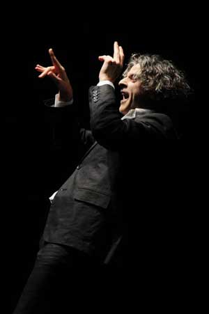 Α.Μ.: Αυτό είναι αποτέλεσμα της δουλειάς που κάναμε και της δουλειάς που κάνει ο Τερζόπουλος φυσικά ο οποίος δουλεύει πάρα πολύ με το σώμα αλλά με το σώμα – λόγο. Σαφώς και μπορούμε να μιλήσουμε για θέατρα των οποίων η εκκίνηση είναι διαφορετική: Είναι το σώμα, ο λόγος, η ψυχή αλλά καταλήγουμε στο ίδιο σημείο. Η αλήθεια είναι μία οι τρόποι για να φτάσουμε σε αυτήν είναι πολλοί. Ο Τερζόπουλος κάνει μια απίστευτα εξαντλητική και ερευνητική εργασία πάνω στον ηθοποιό και μαζί με τον ηθοποιό μέσα από τις πρόβες. Ουσιαστικά αυτή είναι η έρευνά μας και η αγωνία μας να δομήσουμε και να φτιάξουμε νέα γλώσσα. Όποτε επιτυγχάνεται αυτό είναι πολύ σημαντικό. Θα μπορούσα να αναφέρω ένα λογοπαίγνιο του κειμένου ξερά. Δεν γινόταν όμως. Έπρεπε να είναι προϊόν της δικής μου αποτύπωσης. Έπρεπε να βγαίνει από το σώμα. Το σώμα ανοίγει το χρόνο και αν πρόσεξες στην παράσταση χρειάστηκαν 15 λεπτά από αυτή την αριθμολογία για να φτάσω κάπου. Σημαντικό ρόλο παίζει η επανάληψη, που δεν είναι όμως μια στείρα επανάληψη, συνεχώς σκάβει και ανοίγει το χώρο. Βλέπεις εκεί τη γέννηση αυτού του πράγματος. Βλέπεις πώς γεννιέται αυτή η νέα γλώσσα και αλλά πώς αυτοαναιρείται.