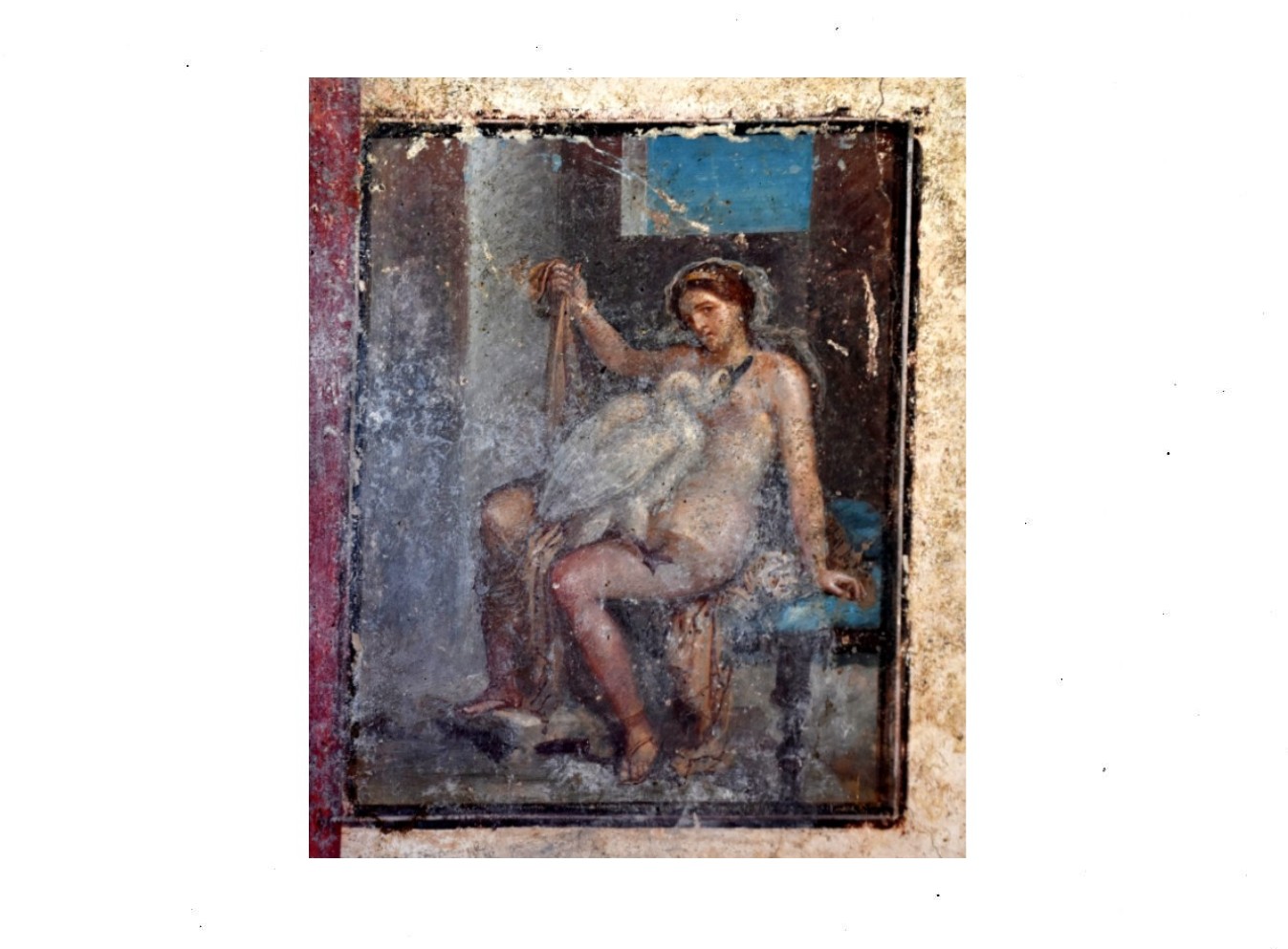 “Leda and the Swan,” a fresco discovered in a bedroom in Pompeii, shows the mythological Spartan queen and the Roman god Jupiter disguised as a swan. (all images courtesy Archaeological Park of Pompeii)