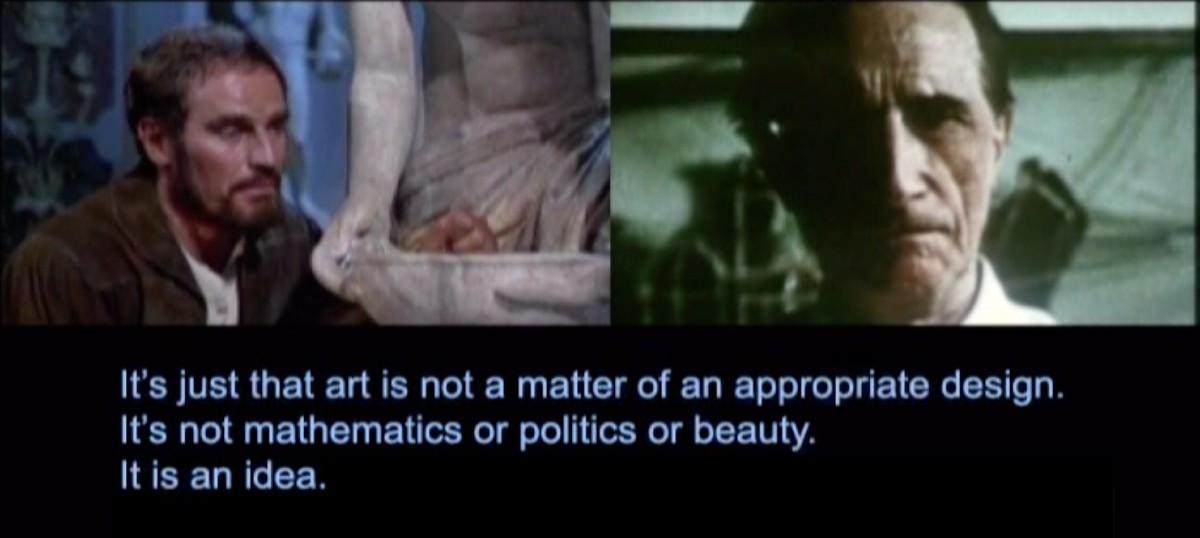 Παράλληλα με την εγκατάσταση, παρουσιάζεται το βίντεο Art scene – Art seen ως μια διπλή προβολή δύο βίντεο σε άμεση συνέργεια. Το πρώτο συγκροτεί ένα κολάζ αποσπασμάτων όπου γνωστοί καλλιτέχνες μιλούν για το έργο τους, ενώ το δεύτερο συνθέτει κινηματογραφικές σκηνές που απεικονίζουν τη ζωή καλλιτεχνών σε στιγμές δημιουργίας. Μέσα από αυτή την παράλληλη δομή, το έργο εξετάζει τη ζωή, τον αγώνα, τον φόβο της αποτυχίας και τη διαρκή αναζήτηση της αναγνώρισης, καθώς και τους μηχανισμούς και τις «παρασκηνιακές» διαδικασίες της καλλιτεχνικής καταξίωσης. Η αντιπαραβολή της βιωμένης πραγματικότητας με την στιλιζαρισμένη, συχνά εξιδανικευμένη κινηματογραφική της απεικόνιση συγκροτεί ένα αιχμηρό σχόλιο πάνω στους μύθους που περιβάλλουν την καλλιτεχνική ταυτότητα—τόσο όπως κατασκευάζονται από τη βιομηχανία του κινηματογράφου όσο και όπως αναπαράγονται από τους ίδιους τους καλλιτέχνες.