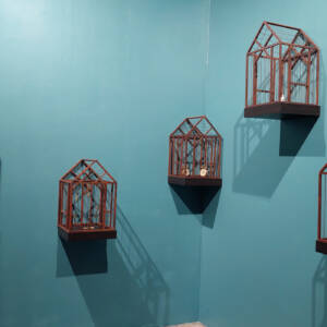 Ο εκθεσιακός χώρος μετασχηματίζεται σε μια site-specific εγκατάσταση που λειτουργεί μεταφορικά ως κλωβός, μέσα στον οποίο αναπτύσσεται μια σειρά από περίτεχνα κλουβιά. Στο εσωτερικό τους, η καλλιτέχνις εγκλείει αντικείμενα που λειτουργούν ως σύμβολα κοινωνικά κατασκευασμένων ρόλων και προσδοκιών: παιχνίδια που παραδοσιακά απευθύνονται σε κορίτσια και υποδηλώνουν μια πρώιμη προετοιμασία για την οικιακότητα και τη μητρότητα, μαζί με ρολόγια, κλειδιά και ταυτότητες. Τα στοιχεία αυτά αναδεικνύουν την εμμονή στερεοτύπων που ορίζουν και περιορίζουν την αντιληπτή φύση της γυναίκας. Περιμετρικά της εγκατάστασης αναπτύσσεται μια χειροποίητη ταπετσαρία που παραπέμπει σε άλλες εποχές, με κλασικά φυτικά μοτίβα μέσα στα οποία ενσωματώνονται κρυμμένα μάτια—σιωπηλοί παρατηρητές που υποδηλώνουν μια συνθήκη διαρκούς επιτήρησης, ενισχύοντας το αίσθημα ελέγχου και περιορισμού.