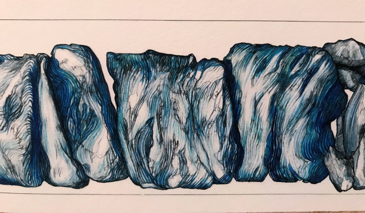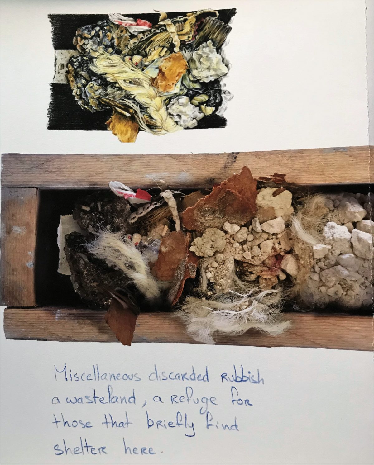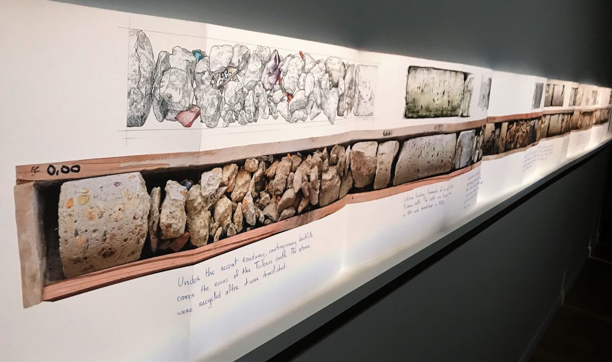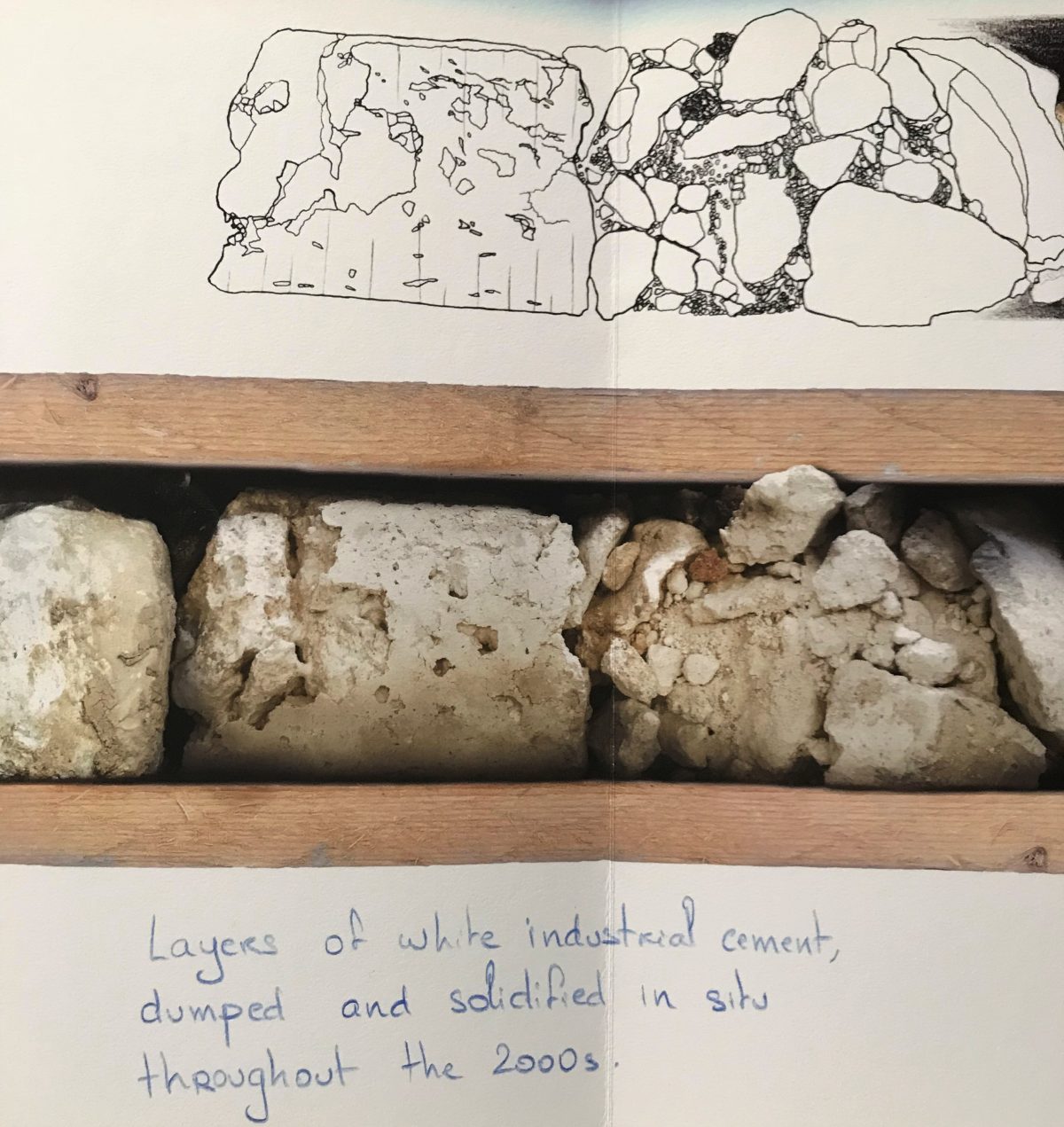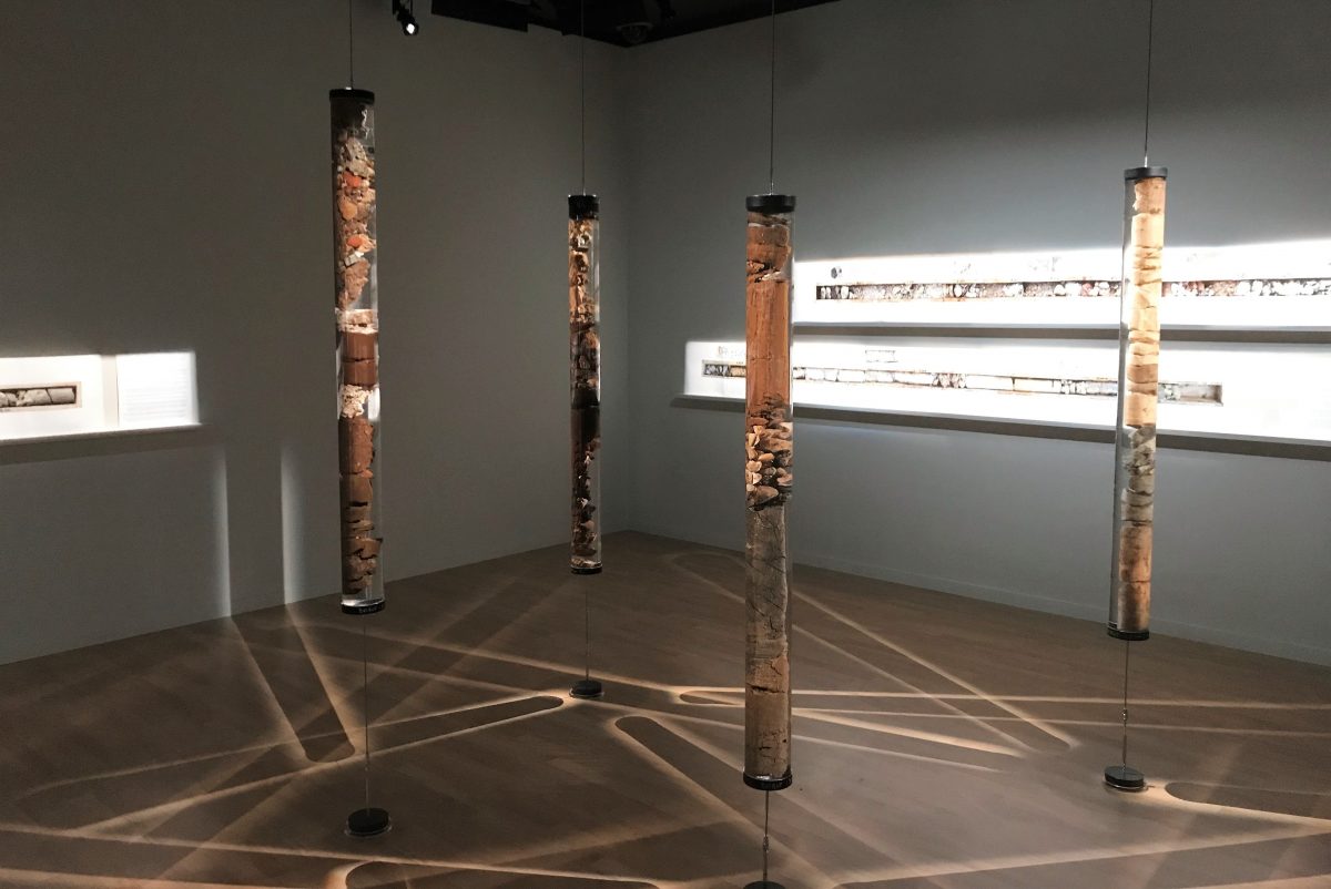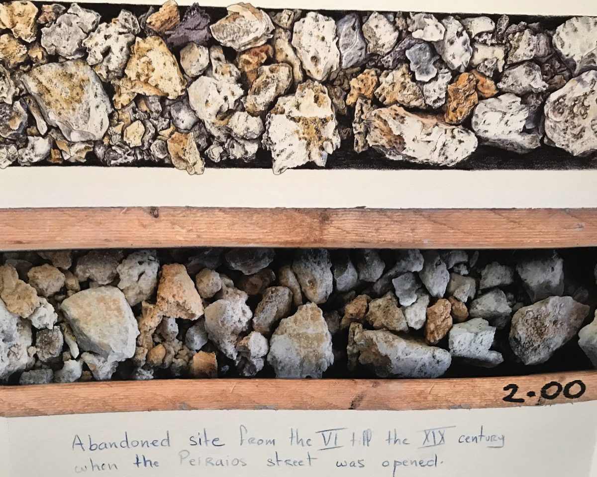 Παράλληλα οι φωτεινές κάθετες διάφανες στήλες τέμνονται οριζόντια, σε έναν αόρατο μα αναπόδραστο ιστό/ grid, από λεπτομερειακά, εικαστικά σχέδια των πετρωμάτων και ψηφιακές φωτογραφίες της ιστορικής τους α-συνέχειας μαζί με χειρόγραφα κείμενα, ως ένα χρονολόγιο δράσεων του ανθρώπου και διαδράσεων με το φυσικό/αστικό του περιβάλλον, σε μία οπτική κατάδειξη της ‘ανακύκλωσης’ πολιτισμών. Ταυτόχρονα παρουσιάζεται βίντεο της διαδικασίας γεωτρητικών πυρήνων και εξόρυξης, μία κινηματογραφική ελεγεία της αναπάντεχης συνάντησης του μηχανικού με το φυσικό, στη Βηρυτό, μία πόλη ‘πρότυπο’ των αλλαγών, συχνά βίαιων, που επιφέρει ο άνθρωπος στον εαυτό του, θυμίζοντας ότι άνθρωπος, αυτό που μαθαίνει μέσα από τις καταστροφές, είναι τελικά το πώς να τις επαναλαμβάνει.