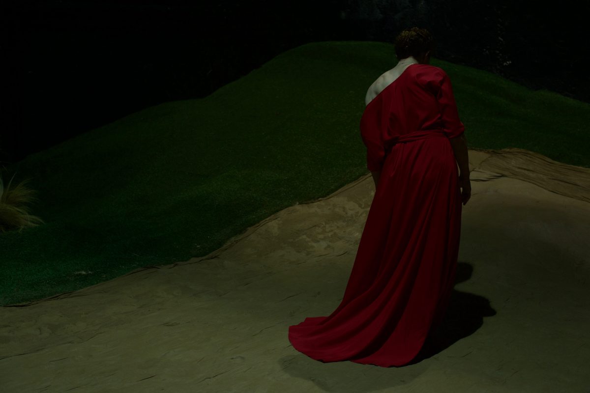 Κατά τη διάρκεια αυτής της διαδικασίας, που κρατά 45 λεπτά, το στόμα της θα εκτοξεύει λέξεις ενός σπασμένου και πολυδιάστατου κειμένου, εξερευνώντας την πηγή της γλώσσας- το τραγούδι πριν γίνει τραγούδι, τη λέξη πριν γίνει λέξη.