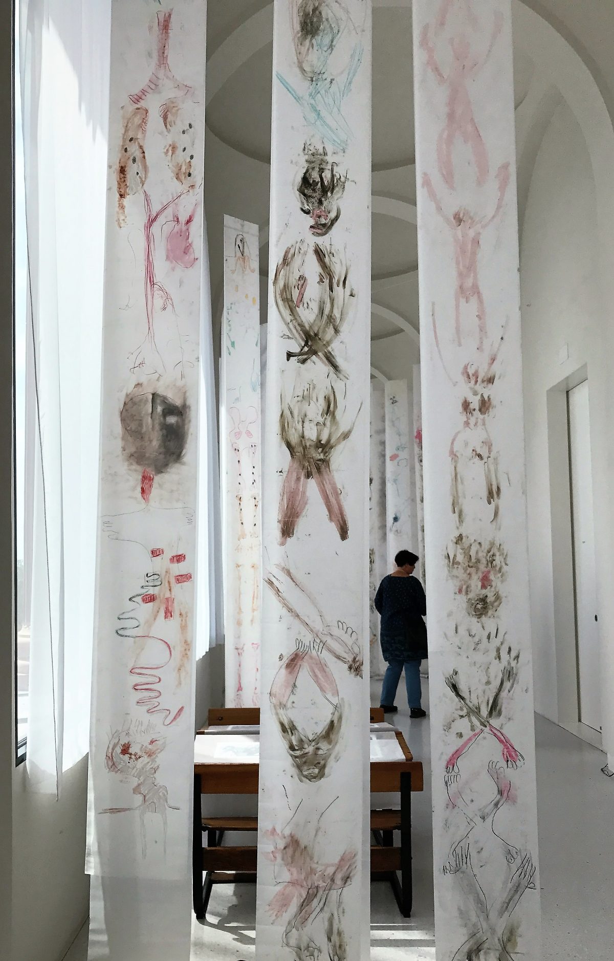 Αυτά τα φαντάσματα του όχι και τόσο μακρινού Γερμανικού παρελθόντος έρχονται να στοιχειώσουν με ποικίλους τρόπους και τη φετινή documenta. Τι πιο στομαχικό από την εικονογραφημένη αφήγηση Live and Die as Eva Braun από την αποκάλυψη θεωρώ της φετινής documenta του Ισραηλινού ζωγράφου, συγγραφέα και σκηνοθέτη Roee Rosen, στο πιο πολιτικό κομμάτι της έκθεσης που στεγάζει το Μουσείο Μπενάκη. Ο καλλιτέχνης παρουσιάζει με γραπτό λόγο και ασπρόμαυρα σχέδια μία φανταστική ανατριχιαστική αφήγηση γύρω από τις τελευταίες στιγμές της ερωμένης του Φύρερ λίγο πριν το γάμο και την από κοινού αυτοκτονία τους στο μπούνκερ του Βερολίνου, προκαλώντας το θεατή να μπει στη θέση της όταν αναστατώνεται επάνω στον τελευταίο τους εναγκαλισμό καθώς την/σε αγγίζει το μουστάκι του, καθώς φουσκώνουν ‘σαν πορφυρά φίδια’ οι φλέβες στο λαιμό του, και ύστερα καθώς η ψυχή αποχωρίζεται το σώμα για ένα αλλόκοτο ταξίδι σαν από έργο του Ιερώνυμου Μπος. Στη Βουλή των Σωμάτων το Μάιο ο Roee Rosen είχε παρουσιάσει το ειρωνικό βίντεο Dust Channel που είδαμε και στο Palais Bellevue στο Κάσελ μαζί με την επίσης συγκλονιστική εγκατάσταση γραπτού λόγου και εικόνας Blind Merchant στο Μουσείο των Αδελφών Γκριμ όπου ο ίδιος υιοθετούσε το ρόλο του Έμπορου της Βενετίας. Αν όμως ήταν να διαλέξω ένα έργο του θα διάλεγα το δεύτερο βίντεο Hilarious που παρουσιάστηκε στο Πάρκο Ελευθερίας όπου μία stand-up κωμικός κάνει όλο το ακροατήριο να ανατριχιάσει με τα ηθελημένα προκλητικά αστεία της που παίζουν με τα στερεότυπα που μας κατακλύζουν.