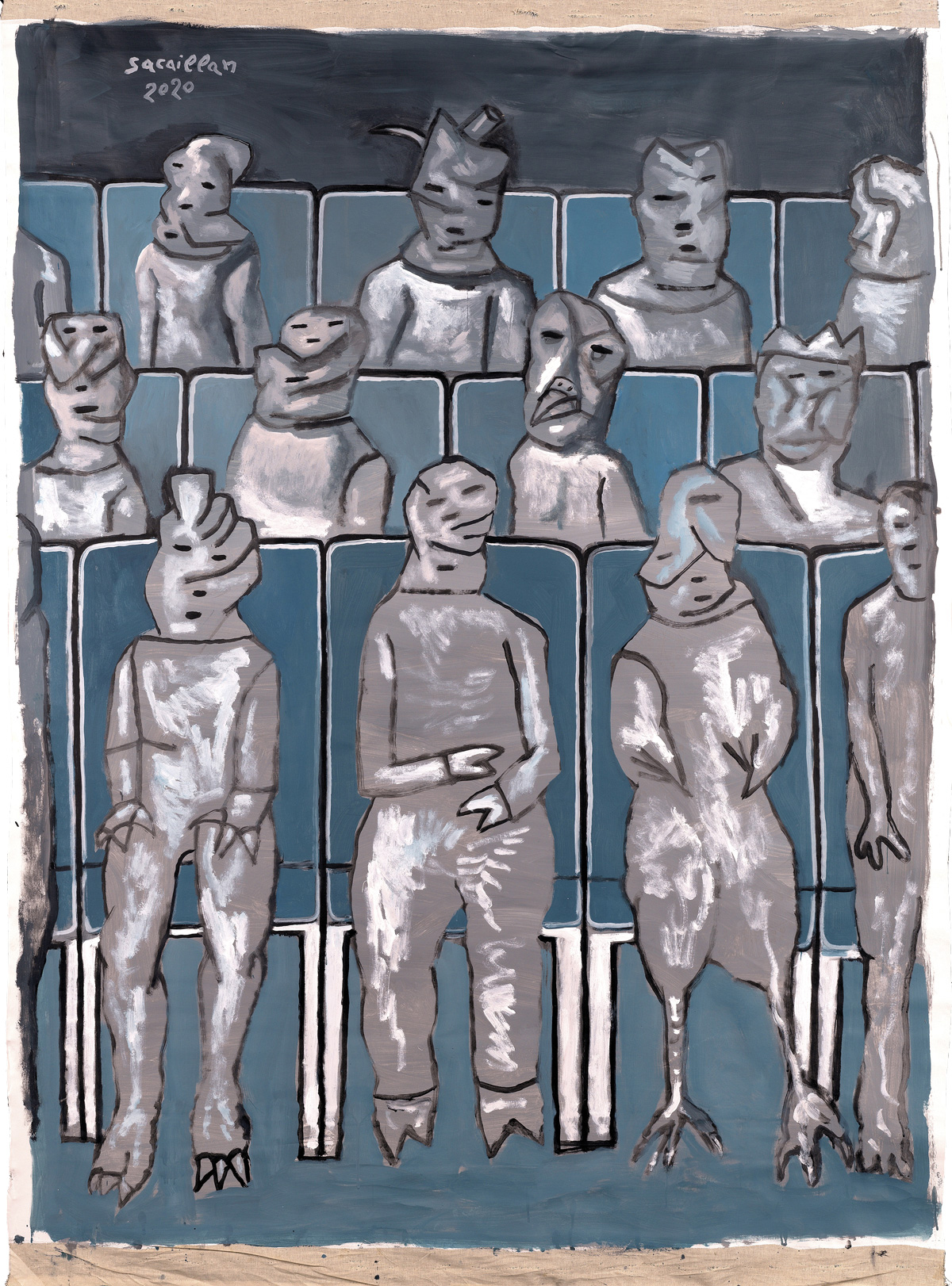 Στη ζωγραφική του, με τον διάχυτο ανθρωποκεντρικό χαρακτήρα, κυριαρχούν τα έντονα χρώματα, αλλά και η προσωπική ματιά του καλλιτέχνη. Οι θεατές του Σακαγιάν δεν νοούνται ως μονάδες, αλλά ως ενιαίο κι αδιαίρετο σύνολο. Παρόλο που διατηρούν στοιχεία της μοναδικής, της ιδιαίτερης ταυτότητάς τους, φαίνεται ότι αυτή υποτάσσεται στις επιταγές του όλου. Το ενδιαφέρον μεταφέρεται στην αποτύπωση της παθητικής συνάθροισης, που γίνεται συνώνυμη της μαζικοποίησης και του όχλου, ενώ παράλληλα η διαφορετικότητα θυσιάζεται στον βωμό μιας αδιάσπαστης ενότητας. Οι σχηματοποιημένες μορφές αποδίδονται χωρίς περιττές λεπτομέρειες -αφαιρετικά- σε καθημερινές -οικίες- σκηνές, που παραπέμπουν στις αστικές κοινωνίες, στις οποίες ζουν και δρουν. Συνεπώς οι θεατές λειτουργούν ως είδωλα της πραγματικότητας, την οποία καθένας καλείται να αποκωδικοποιήσει με γνώμονα τόσο τη συλλογική όσο και την ατομική εμπειρία. Παρόλο που η εικόνα που συντίθεται είναι γνώριμη, «η δύναμή της επανέρχεται με την αυτονομία της και όχι με την ψευδαίσθηση και την συνήθεια του “déjà vu”», τονίζει ο Εδουάρδος Σακαγιάν.