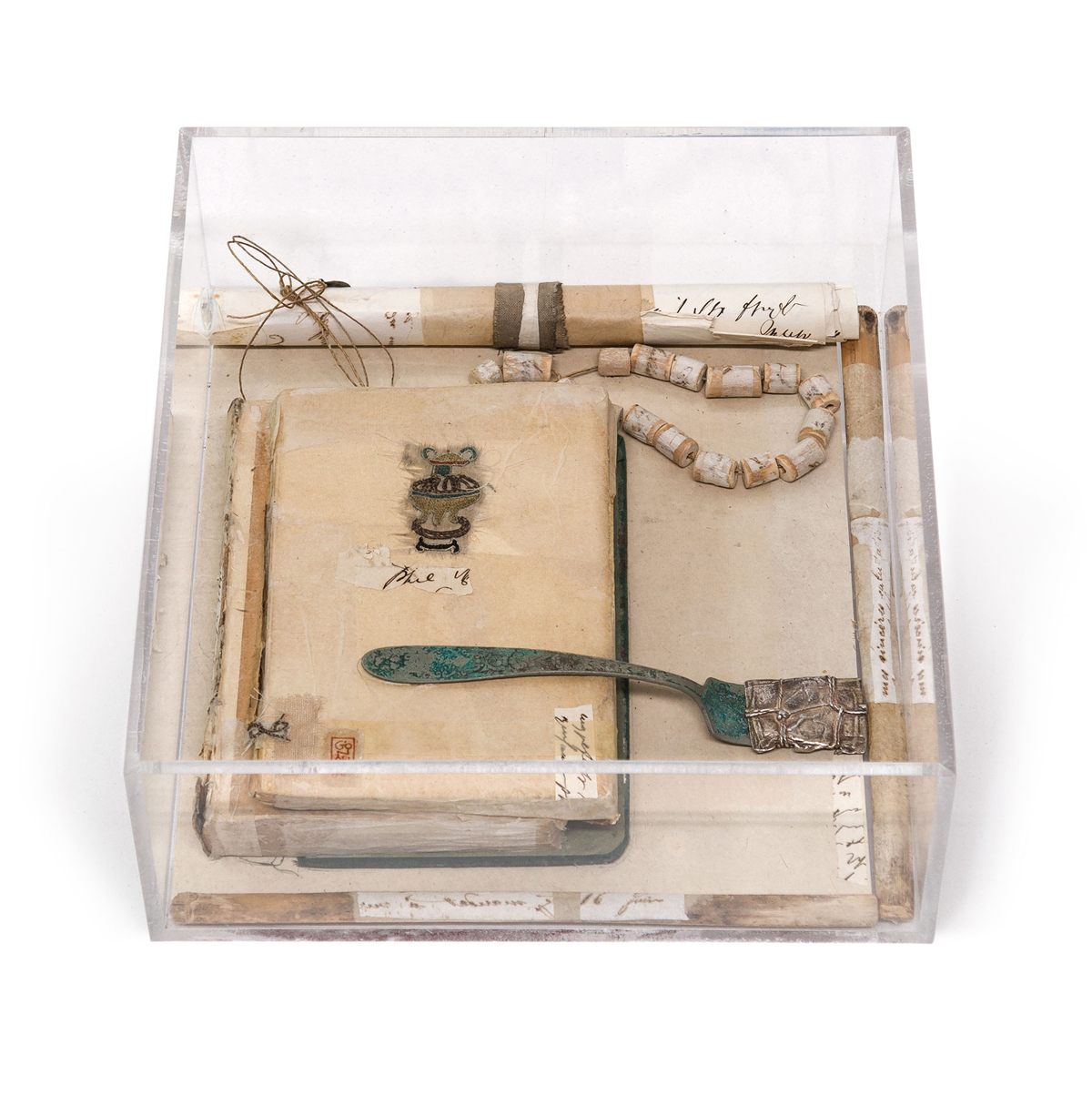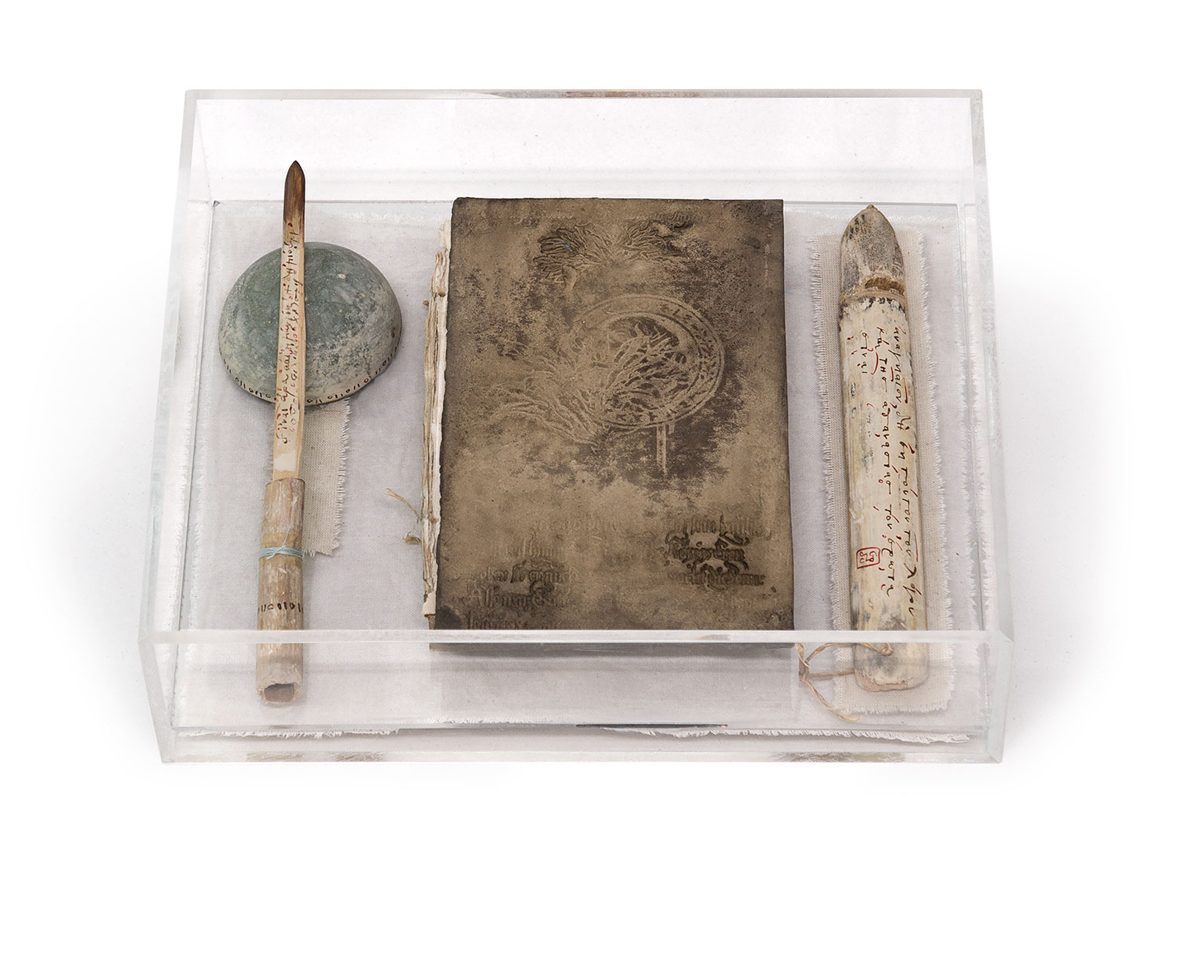 Τα βιβλία-φυλαχτά, οι «γραμμένοι» καρποί, οι μαγικές κούπες με limoo amani, ένα φύλλο φοίνικα με γραφές, υφασμάτινες θήκες αρωματικής ρητίνης με αποτρεπτικές ιδιότητες, το nyama, διάφορα άλλα μικρά αντικείμενα καθώς και επιτοίχια τμήματα προστατευτικών πανιών πλαισιώνουν την έκθεση με το αινιγματικό τους περιεχόμενο αφήνοντας ανοιχτή την πρόταση για προσωπικές εικασίες και ερμηνείες.
