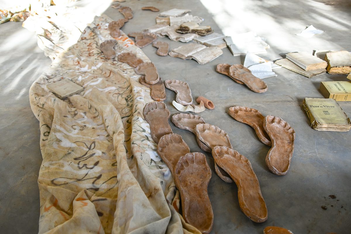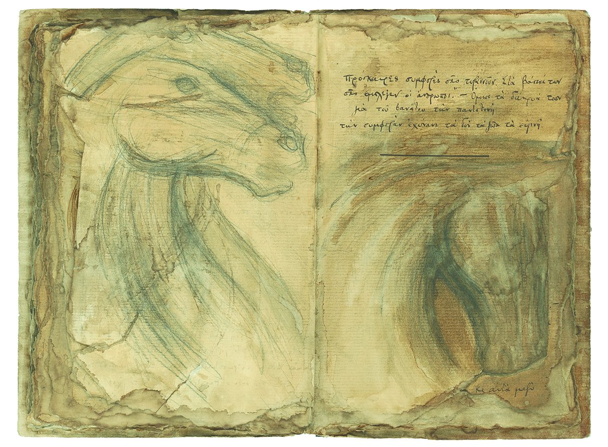 Βιβλία απλωμένα σε ένα μεγάλο τραπέζι κι άλλα κρεμασμένα στον τοίχο, πλάι σε μεγάλα μεταλλικά κηροπήγια με τη φλόγα των κεριών τους άλλοτε να τρεμοπαίζει κι άλλοτε να είναι σβηστή. Τρία καράβια από κυματοδαρμένα ξύλα και φαγωμένα από τον άνεμο μέταλλα «πλέουν» σε μια θάλασσα από πήλινα βήματα. Και πλάι τους ένας σιωπηλός καταρράκτης πηγάζει από τον τοίχο αφήνοντας να πέσουν στο δάπεδο δεκάδες γκραφίτι.