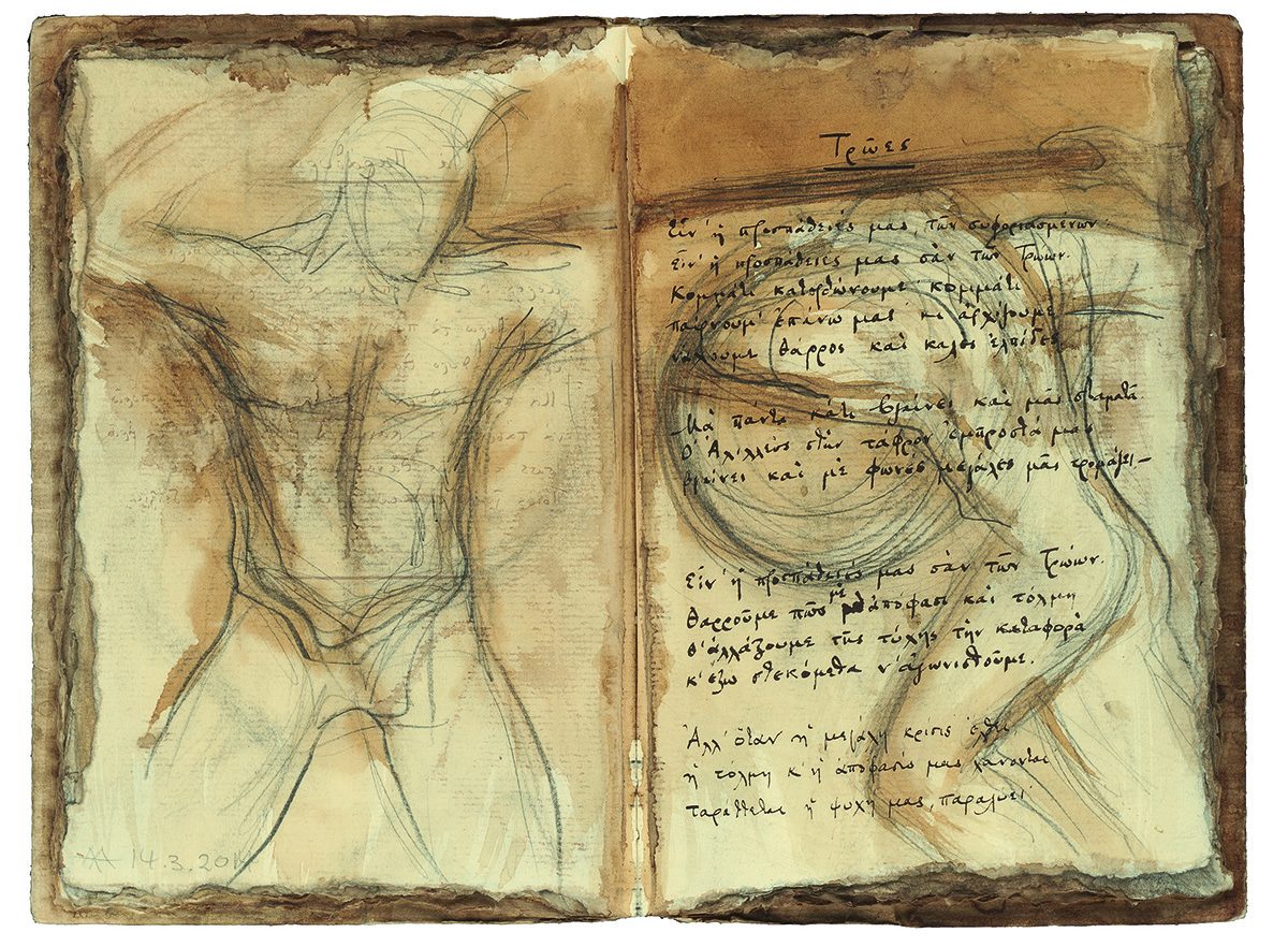 «Ο γραφικός χαρακτήρας του Καβάφη, αλλά και το ίχνος που αφήνει η γραφή στην πίσω πλευρά κάθε σελίδας με ενδιαφέρουν πολύ. Γι’ αυτό και επέλεξα 18 αντίτυπα από την συγκεκριμένη έκδοση, παλαίωσα τις σελίδες της με τσάι και καφέ, με μολύβι ή ακόμη και σκίζοντας τις άκρες κι άρχισα να δημιουργώ τα δικά μου βιβλία, άλλοτε πιο κλειστά, άλλοτε περισσότερο ανοιχτά ώστε τα αποσπάσματά τους να μην διαβάζονται πάντα εύκολα, όπως ακριβώς συμβαίνει και με τον εαυτό μας: αποκαλύπτουμε ένα μέρος του κι ένα άλλο το κρατάμε κρυφό», λέει η Αλεξάνδρα Αθανασιάδη για το νέο σύνολο έργων της, το οποίο ξεκίνησε από έναν ανάγλυφο κορμό χτισμένο από μεγεθυσμένα και ταλαιπωρημένα θραύσματα χειρόγραφων ποιημάτων που δημιούργησε το 2013 για μια έκθεση στους Δελφούς με αφορμή τα 150 χρόνια από τη γέννηση του Κ.Π. Καβάφη και 80 από το θάνατό του.