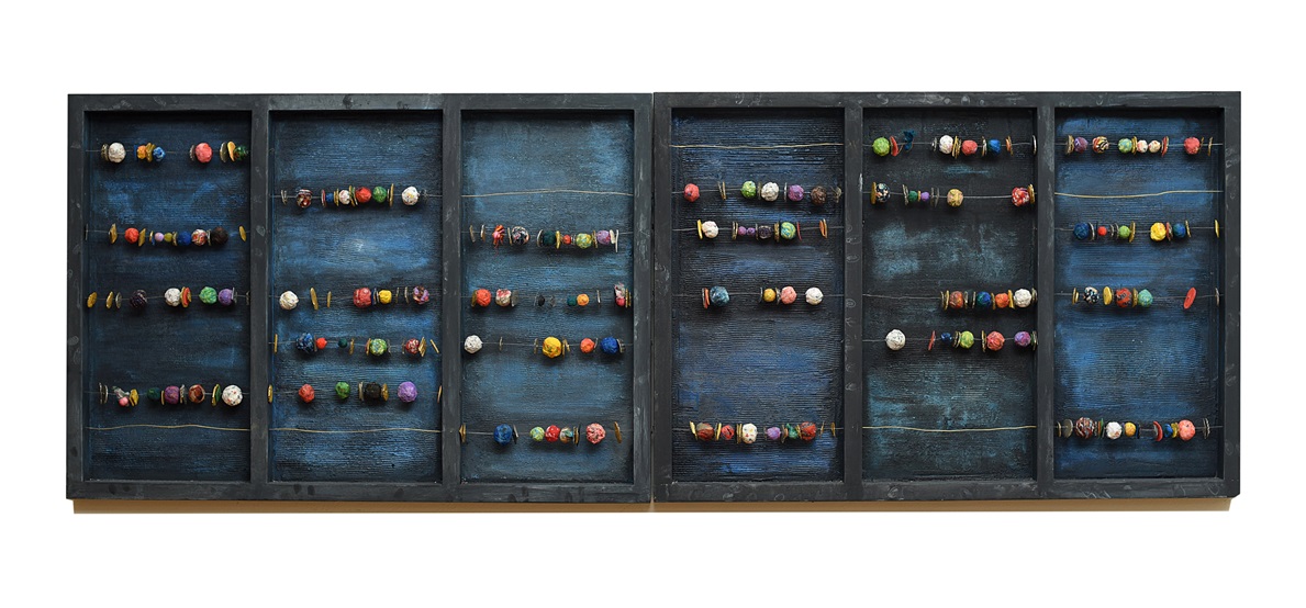 Κεντρική φωτογραφία θέματος: Λόγια της σιωπής, ύφασμα-κλωστές-ξύλο, 80x78x78 εκ, λεπτομέρεια