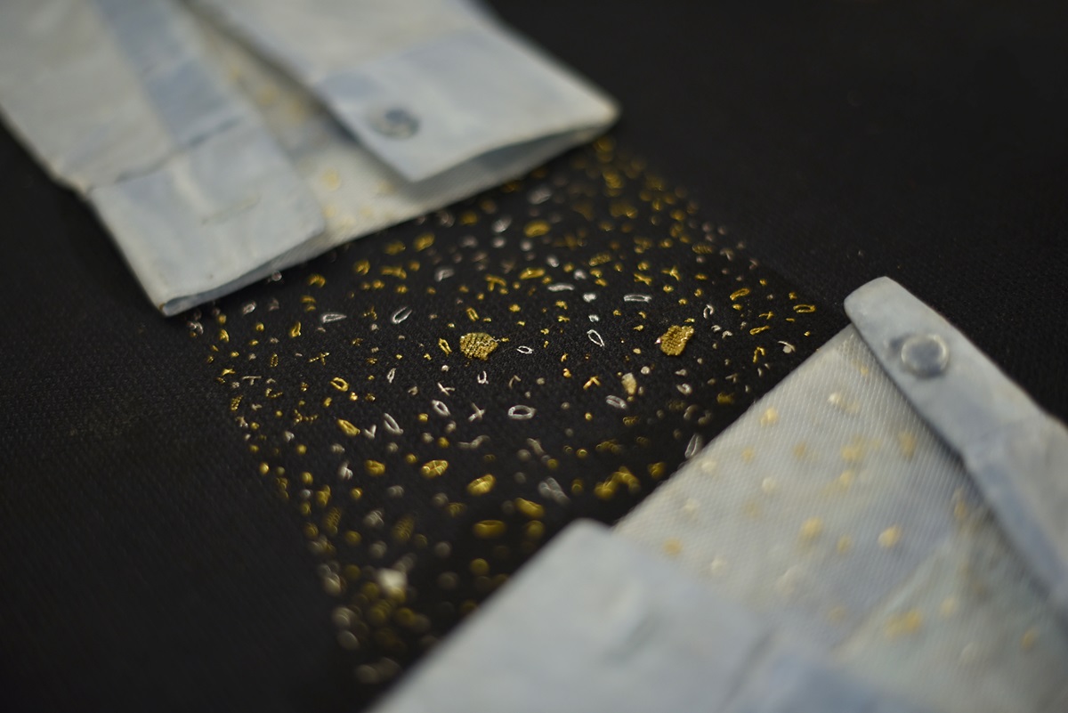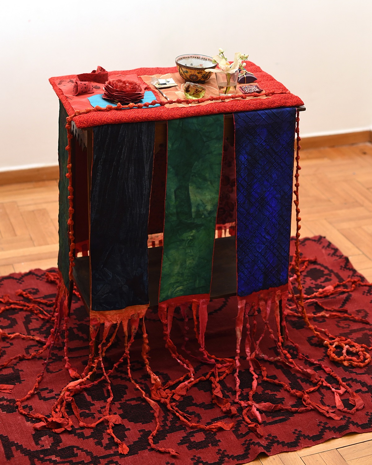 Κεντρική φωτογραφία θέματος: Λόγια της σιωπής, ύφασμα-κλωστές-ξύλο, 80x78x78 εκ, λεπτομέρεια