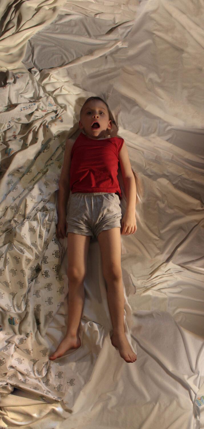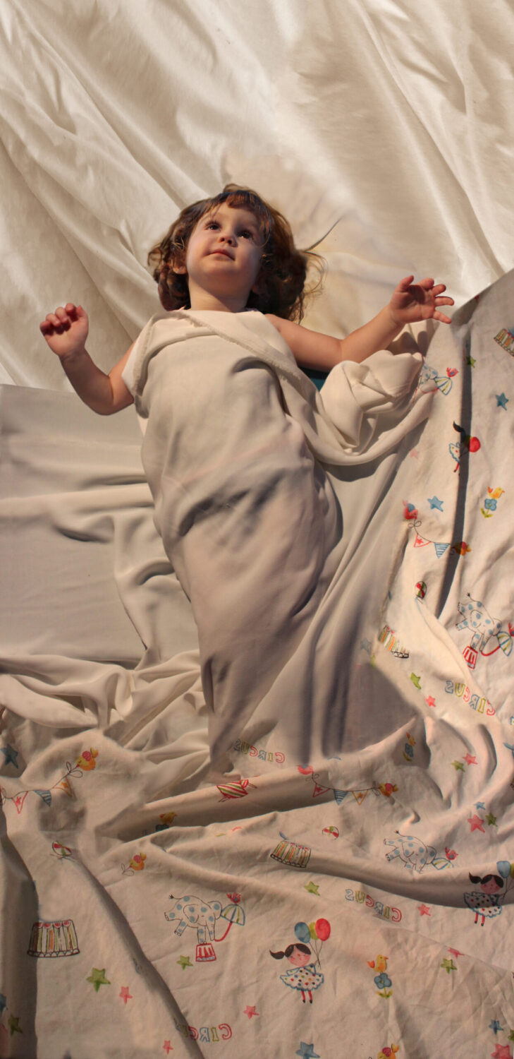 Στη δεξιά πτέρυγα του κτηρίου της Κρεαταγοράς, ο θεατής συναντά τη σειρά φωτογραφιών με τίτλο τα κοιμώμενα παιδιά (2001 – 2020). Λευκά και εμπριμέ παιδικά σεντόνια καλύπτουν μέρη του σώματος παιδιών και παράλληλα αποτελούν το φόντο τους. Οι υφές και οι πτυχώσεις των υφασμάτων, καθώς και τα σώματά τους τονίζονται σε σημεία με φως, αφήνοντας άλλα μέρη στη σκιά. Αυτή η έντονη αντίθεση φωτός και σκιάς, η οποία αποδίδεται με την τεχνική του chiaroscuro στους πίνακες του Μπαρόκ αυξάνει το δραματικό αποτέλεσμα της σκηνής, εκφράζει την πνευματική αναλαμπή και τον εξαγνισμό. Οι πτυχώσεις που διαγράφουν αναρίθμητες κινήσεις μέσα σε κάθε φωτογραφία, δημιουργούν την ψευδαίσθηση του συνεχές και του απείρου, όπως και πάλι συμβαίνει στην τέχνη του Μπαρόκ.