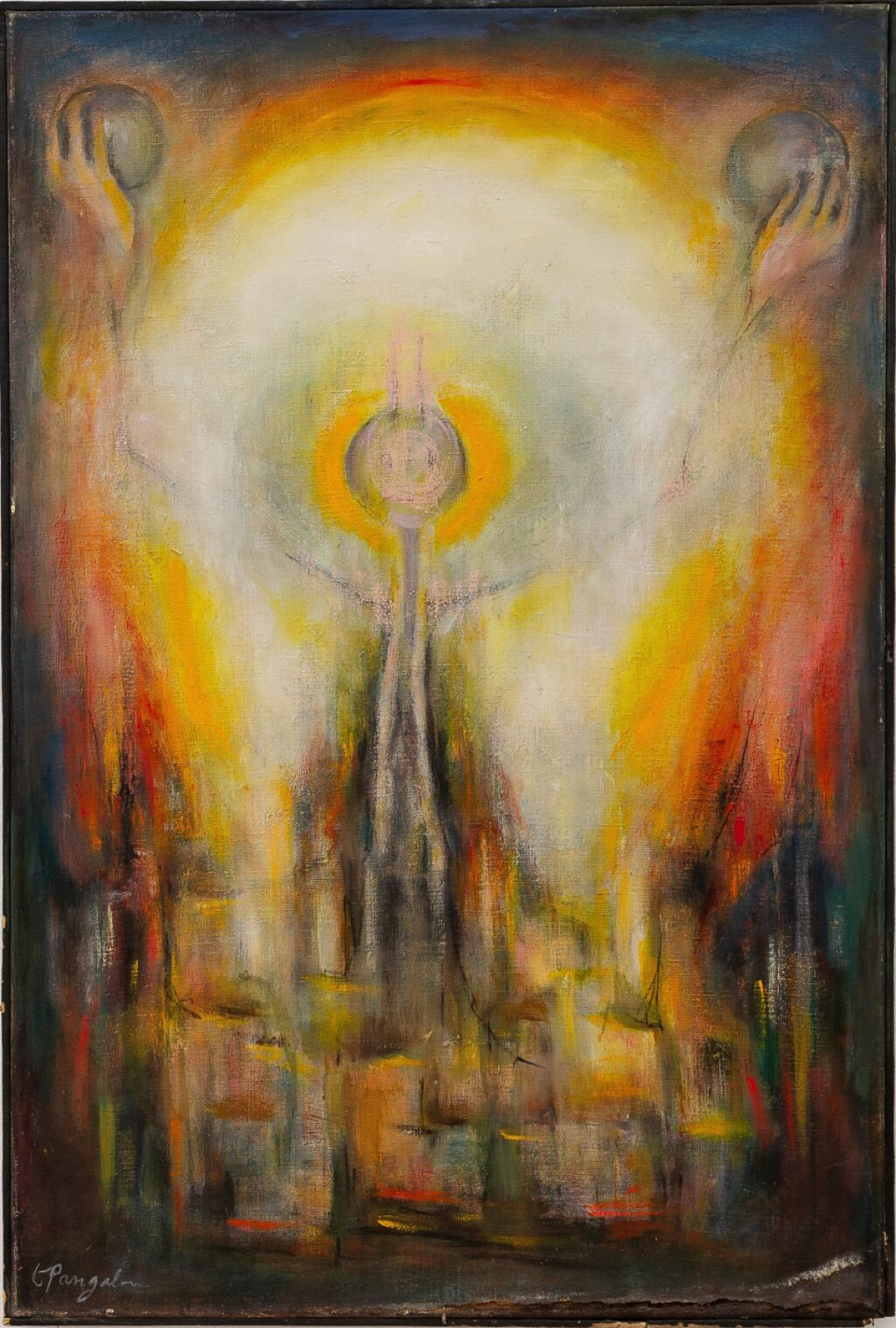 Στα περισσότερα έργα κυριαρχεί συχνά μια κεντρική πηγή φωτός – ένας δίσκος, ένας ήλιος, ένας σπειροειδής πυρήνας – που λειτουργεί ταυτόχρονα ως εστία της σύνθεσης και ως μεταφυσικό ορόσημο. Γύρω του οργανώνονται ρευστές μορφές, άλλοτε ανθρωπόμορφες και άλλοτε άυλες, σαν ίχνη παρουσιών που αναδύονται μέσα από το χρώμα και αμέσως μετά διαλύονται. Η αίσθηση του φουτουριστικού εδώ δεν προκύπτει από τεχνολογικές αναφορές, αλλά από μια κοσμολογική φαντασία: οι πίνακες μοιάζουν να απεικονίζουν τοπία ενός άλλου χρόνου ή ενός άλλου σύμπαντος, όπου η ανθρώπινη μορφή έχει μετασχηματιστεί σε ενέργεια.