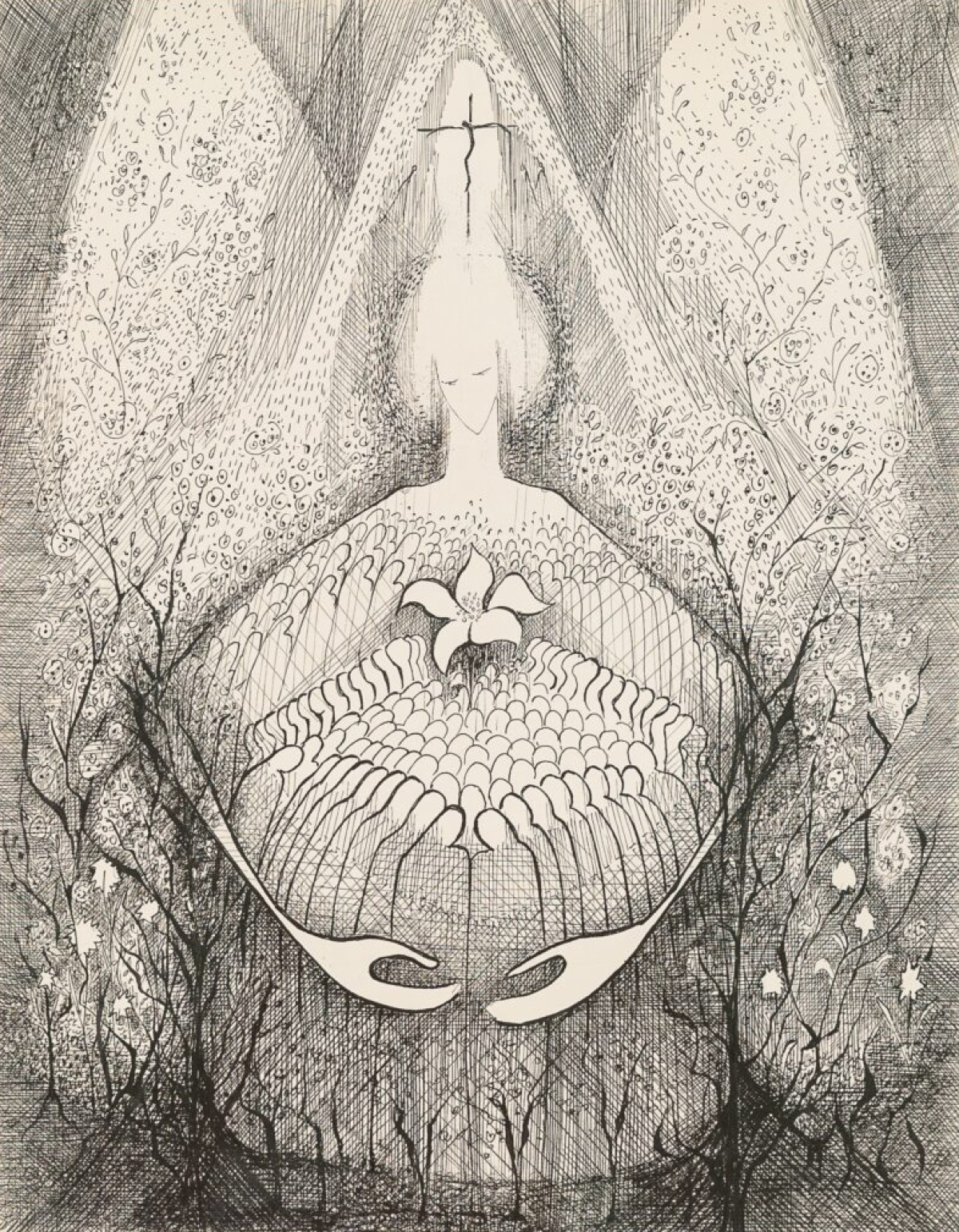 Ωστόσο, το πιο ριζοσπαστικό και προσωπικό της σώμα δουλειάς φαίνεται να αναδύεται τη δεκαετία του 1960 και του 1970 μέσα από τα ασπρόμαυρα σχέδια με μελάνι σε χαρτί. Πρόκειται για έργα που λειτουργούν σαν εσωτερικοί χάρτες: φαντασιακοί χώροι, υβριδικές μορφές και επαναλαμβανόμενα μοτίβα οργανώνονται σε συνθέσεις υψηλής έντασης. Η επιφάνεια ενεργοποιείται στο σύνολό της, δημιουργώντας εικόνες που ισορροπούν ανάμεσα στον έλεγχο και τον αυθορμητισμό. Η πυκνή κάλυψη της επιφάνειας, στο όριο του horror vacui, υποδηλώνει μια εμμονική ανάγκη καταγραφής, σαν η καλλιτέχνις να προσπαθεί να συγκρατήσει κάτι που διαρκώς διαφεύγει. Τα σχέδια αυτής της περιόδου αποτελούν κομβικό κεφάλαιο της πρακτικής της και συμπυκνώνουν με καθαρότητα το εικαστικό της λεξιλόγιο.