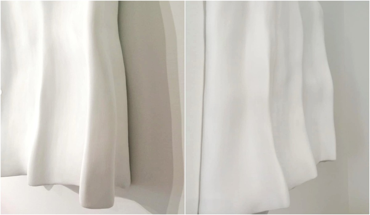 Μέσα από λευκές και απαλές πράσινες αποχρώσεις, οι επιτοίχιες γλυπτικές μορφές της λειτουργούν σαν ήχοι σιωπής. Δεν αφηγούνται κάτι συγκεκριμένο, αλλά προτείνουν μια αίσθηση ηρεμίας και καθαρότητας — έναν χώρο όπου το βλέμμα μπορεί να σταθεί και να αναπνεύσει. Η δουλειά της εκφράζει τη μετάβαση από τη ζωγραφική στη γλυπτική, όπου η επιφάνεια μετατρέπεται σε χώρο και το φως αποκτά υλική υπόσταση.