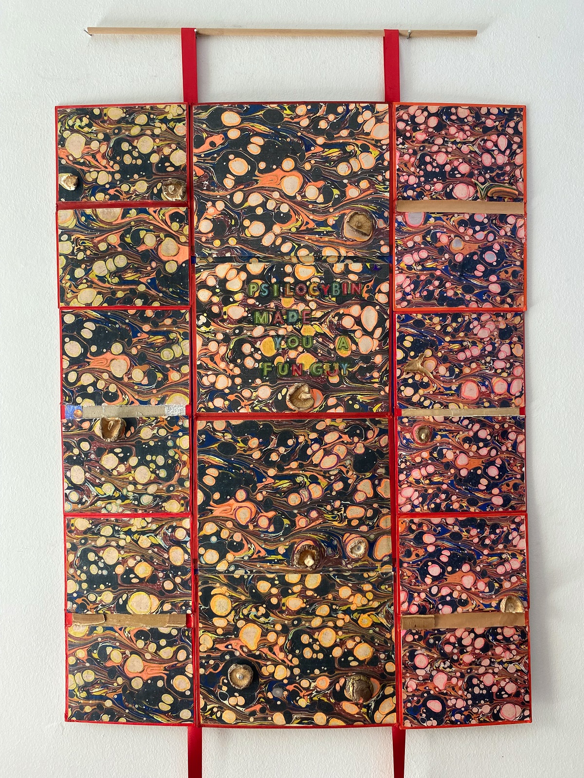 Κεντρική φωτογραφία θέματος: Χριστίνα Μήτρεντσε, The future is Fungi – (Orange bonnet versus slippery cap), 2023. Μεταποιημένα χειροποίητα βιβλία, μπαλάκι τένις, ψηφιακή εκτύπωση, σκόνη παστέλ, 45 x 35 εκ. Παραχώρηση CITRONNE Gallery. (Λεπτομέρεια έργου)