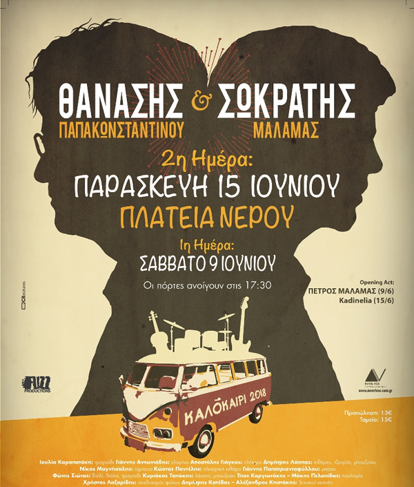 Επιθυμώντας να ικανοποιήσουμε αυτήν την, χωρίς προηγούμενο, ζήτηση που υπάρχει και, κυρίως, αποσκοπώντας στην καλύτερη δυνατή εξυπηρέτηση των χιλιάδων μουσικόφιλων που επιθυμούν να παρευρεθούν στη συναυλία των Θανάση Παπακωνσταντίνου και Σωκράτη Μάλαμα, στην ήδη υπάρχουσα ημερομηνία (Σάββατο 9 Ιουνίου) προστίθεται και η Παρασκευή 15 Ιουνίου, επίσης στην Πλατεία Νερού.