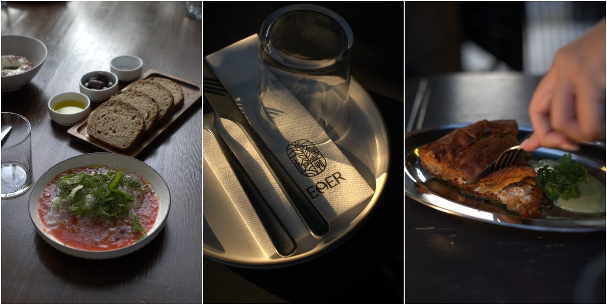 Στο Ether η κουζίνα είναι ένας από τους βασικούς λόγους που θες να επιστρέφεις. Οι μερίδες είναι γενναιόδωρες, οι γεύσεις πλούσιες αλλά καθαρές, και τα πιάτα πατούν γερά στην ελληνική παράδοση, με μικρές δημιουργικές πινελιές. Στην αρχή θα έρθει στο τραπέζι το ψωμί αργής φυσικής ωρίμανσης 16 ωρών, που είναι από μόνο του εμπειρία, μαζί με τον περίφημο λευκό ταραμά που έχει γίνει talk of the town σε όλη την Αθήνα. Και σχεδόν καθημερινά θα βρεις μια διαφορετική χειροποίητη πίτα, φτιαγμένη εκείνη την ημέρα, με ό,τι καλύτερο έφερε η αγορά.