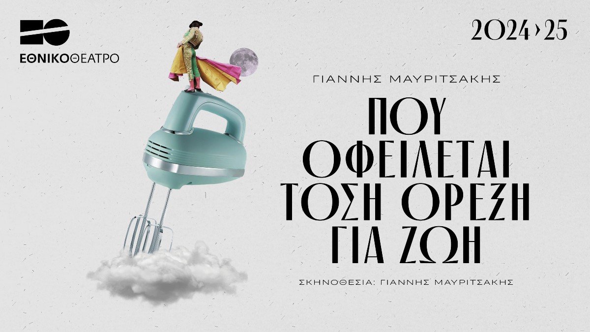 Μετά το Βόλφγκανγκ και το Vitrioli, ο Γιάννης Μαυριτσάκης επιστρέφει στο Εθνικό Θέατρο με το καινούργιο του έργο –υπογράφοντας για πρώτη φορά και τη σκηνοθεσία του– για να απεικονίσει σκηνικά με τα φωτεινότερα χρώματα το πιο μύχιο αίτημα της ανθρώπινης ύπαρξης: την αθανασία. Μια παράδοξη κωμωδία που υπόσχεται να μας ταξιδέψει στον χωροχρόνο και να μας παρασύρει σε περιοχές του συλλογικού φαντασιακού, ίσως ακόμα και στη στρατόσφαιρα της αιωνιότητας.