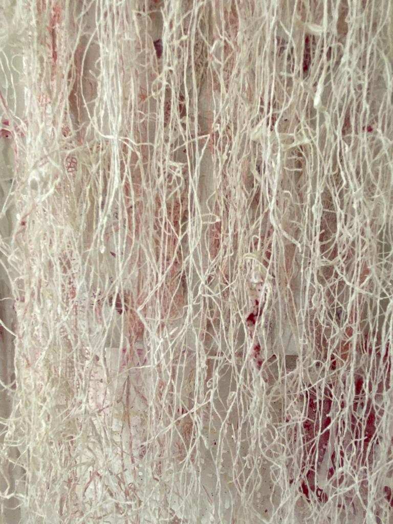 Κεντρική φωτογραφία θέματος: EYΓENIA AΠOΣTOΛOY_Ασκήσεις Αυτοτομίας_2022_Μελάνι, Λάδι γάζα κόλλα σε καμβά_150χ110cm_ λεπτομέρεια