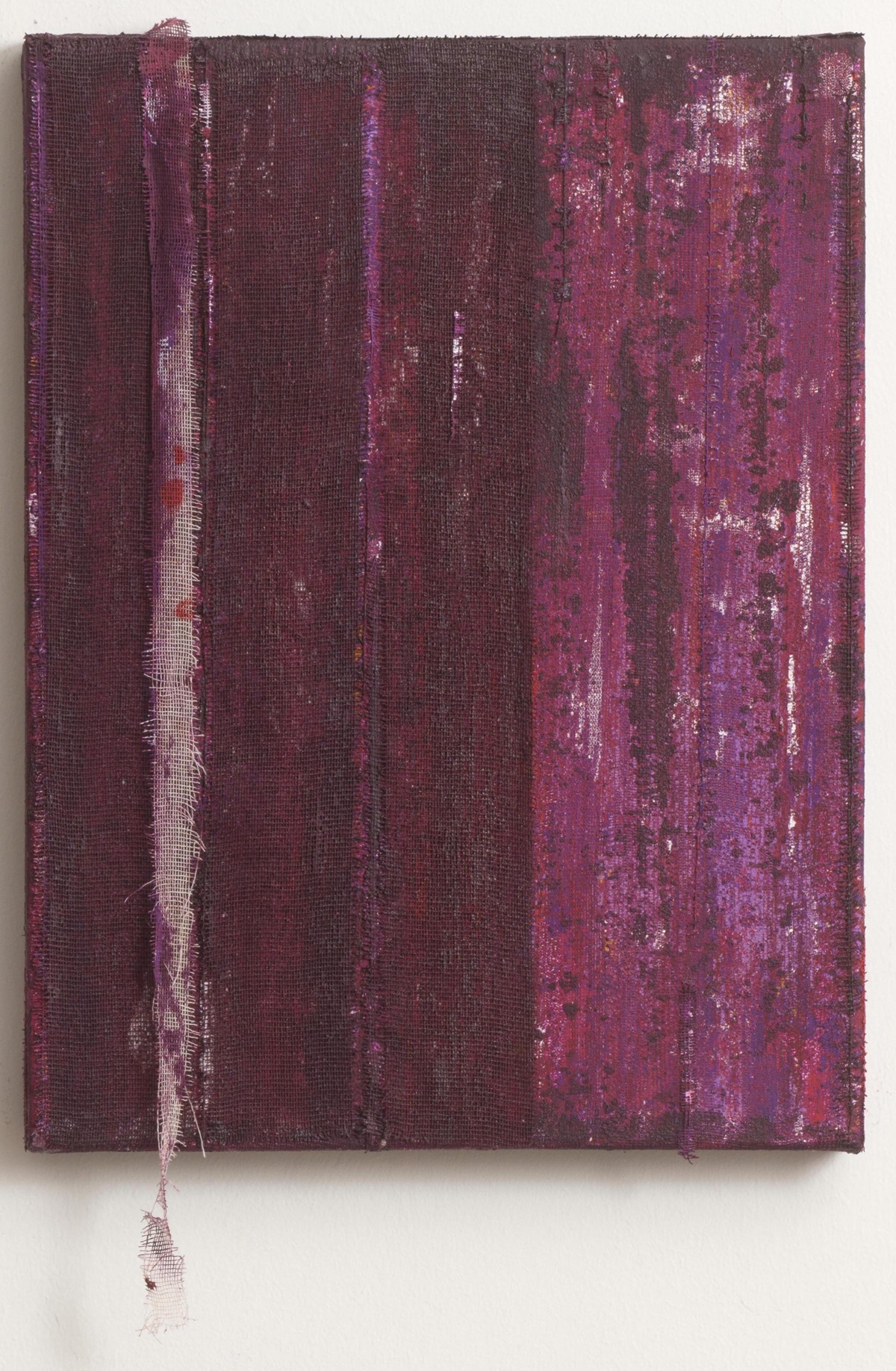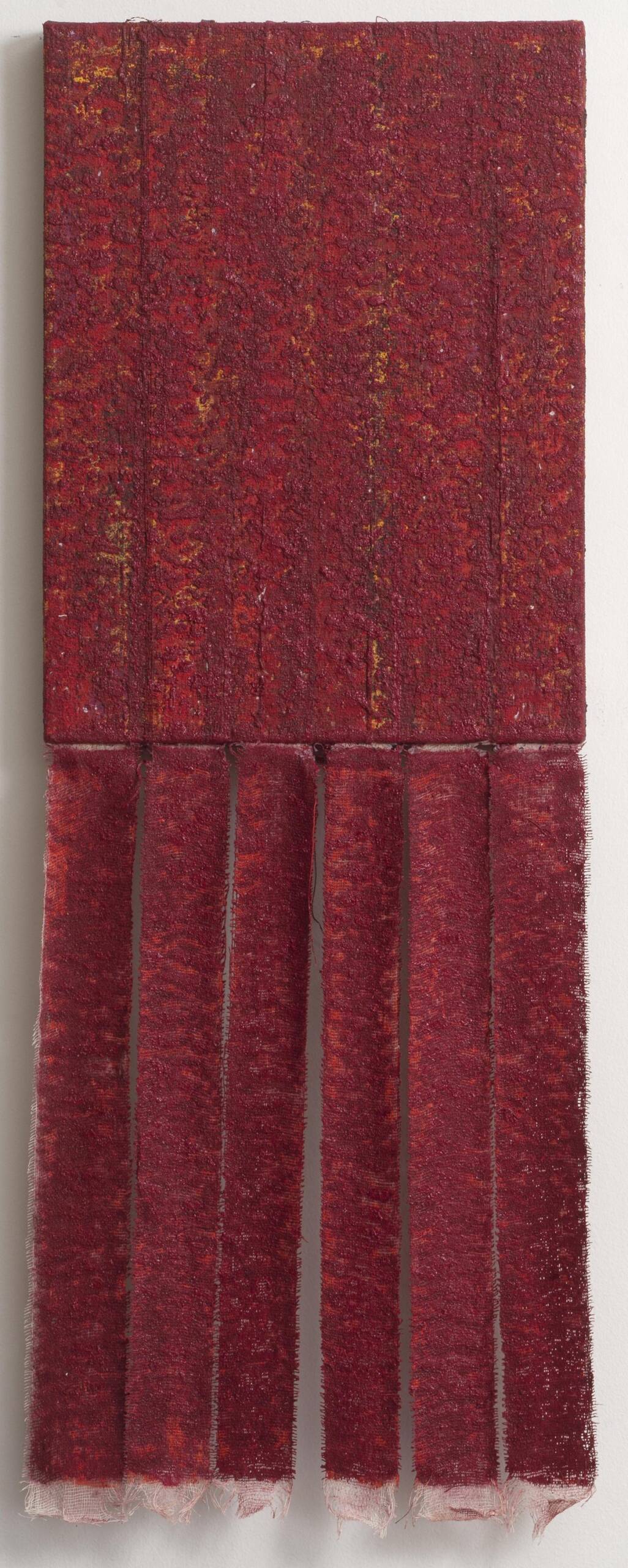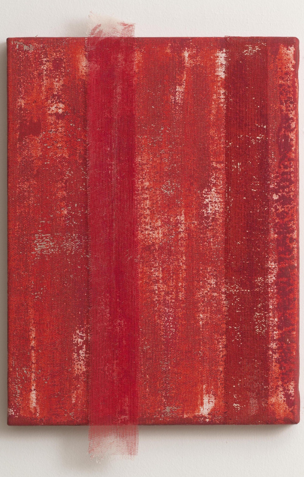 Η καλλιτέχνιδα, μέσω της χειρουργικής γάζας, ανασύρει πολιτισμικές και σωματικές αναφορές και παραπέμπει σε πρακτικές κάλυψης, προστασίας και φροντίδας· σε τραυματισμένες επιφάνειες και χειρονομίες περίθαλψης. Οι κόκκινες τονικότητες εντείνουν αυτές τις συνδηλώσεις στα ενδότερα του σώματος, σε μια τοπιογραφία που αναδύεται εκ των έσω.
