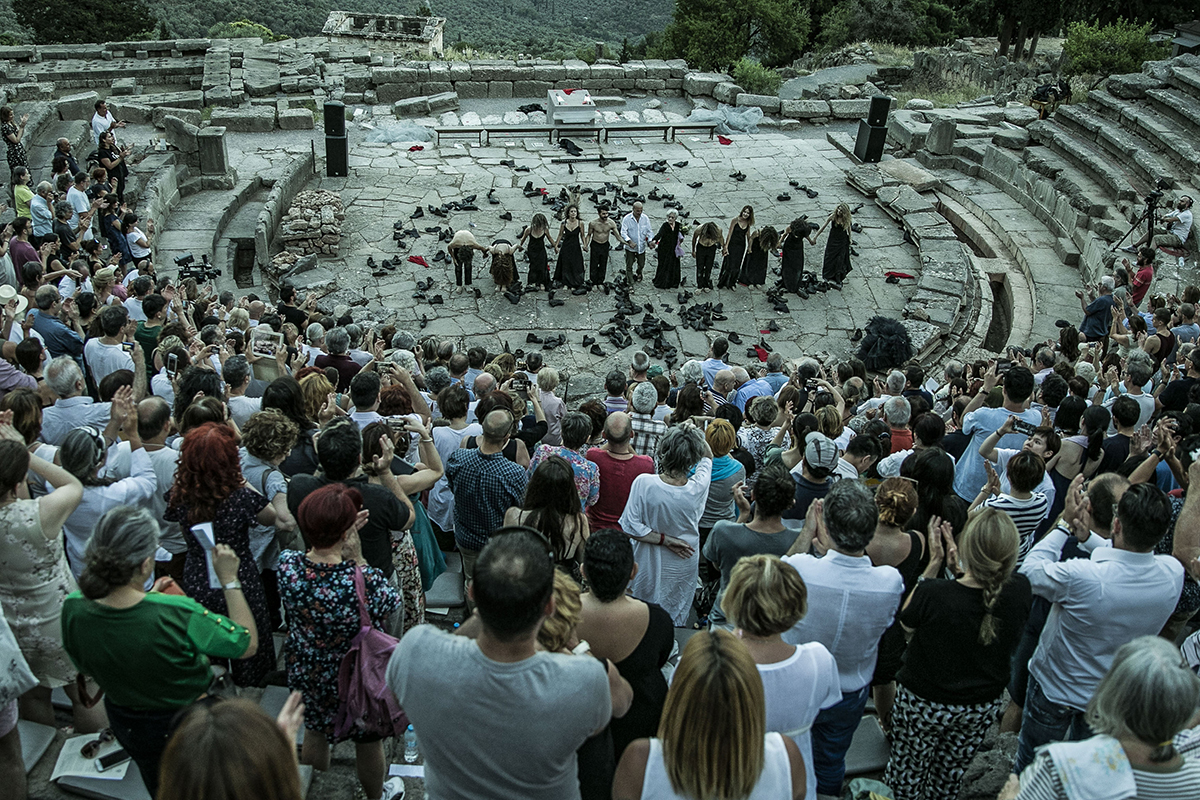 Το απόγευμα της ίδιας μέρας, στο Αρχαίο Θέατρο των Δελφών, στο τέλος της συγκλονιστικής παράστασης Τρωάδες, οι θεατές αποθέωσαν με ένα συνεχές χειροκρότημα τον σκηνοθέτη Θεόδωρο Τερζόπουλο και τους ηθοποιούς, εστιάζοντας στην μοναδική ερμηνεία της Δέσποινας Μπεμπεδέλη στο ρόλο της Εκάβης.