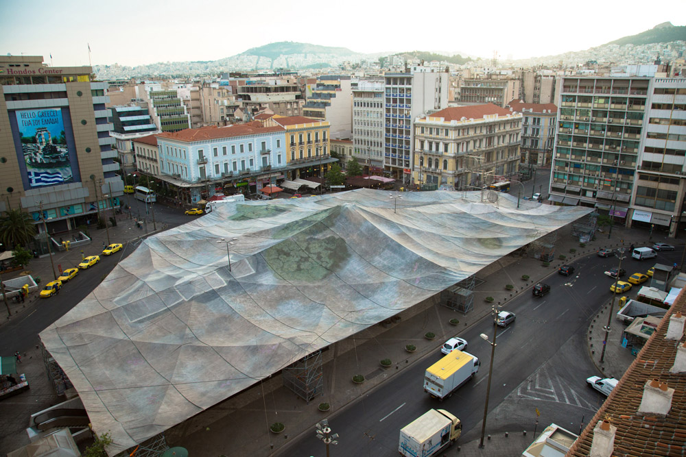 Στο πλέγμα που καλύπτει σαν προστατευτικό δέρμα την Ομόνοια είναι ζωγραφισμένο στο χέρι ένα παραθαλάσσιο τοπίο της Κω που φαίνεται ολόκληρο μόνο από ψηλά. Αξιοποιώντας την τεχνική του καμουφλάζ και συνδέοντάς την με την αορατότητα της ιστορικής πλατείας από ψηλά, ο Γκρέγκορ Σνάιντερ δημιούργησε, χρησιμοποιώντας 4.600 μέτρα ύφασμα, την απεικόνιση μιας ακτής που φτάνουν οι πρόσφυγες από την Τουρκία. Από χαμηλά το έργο μοιάζει με ένα προσωρινό εργοτάξιο στην καρδιά της Αθήνας που καθιστά το κέντρο της σημείο συνάντησης του ορατού με το αόρατο, της τέχνης με την ψευδαίσθηση.