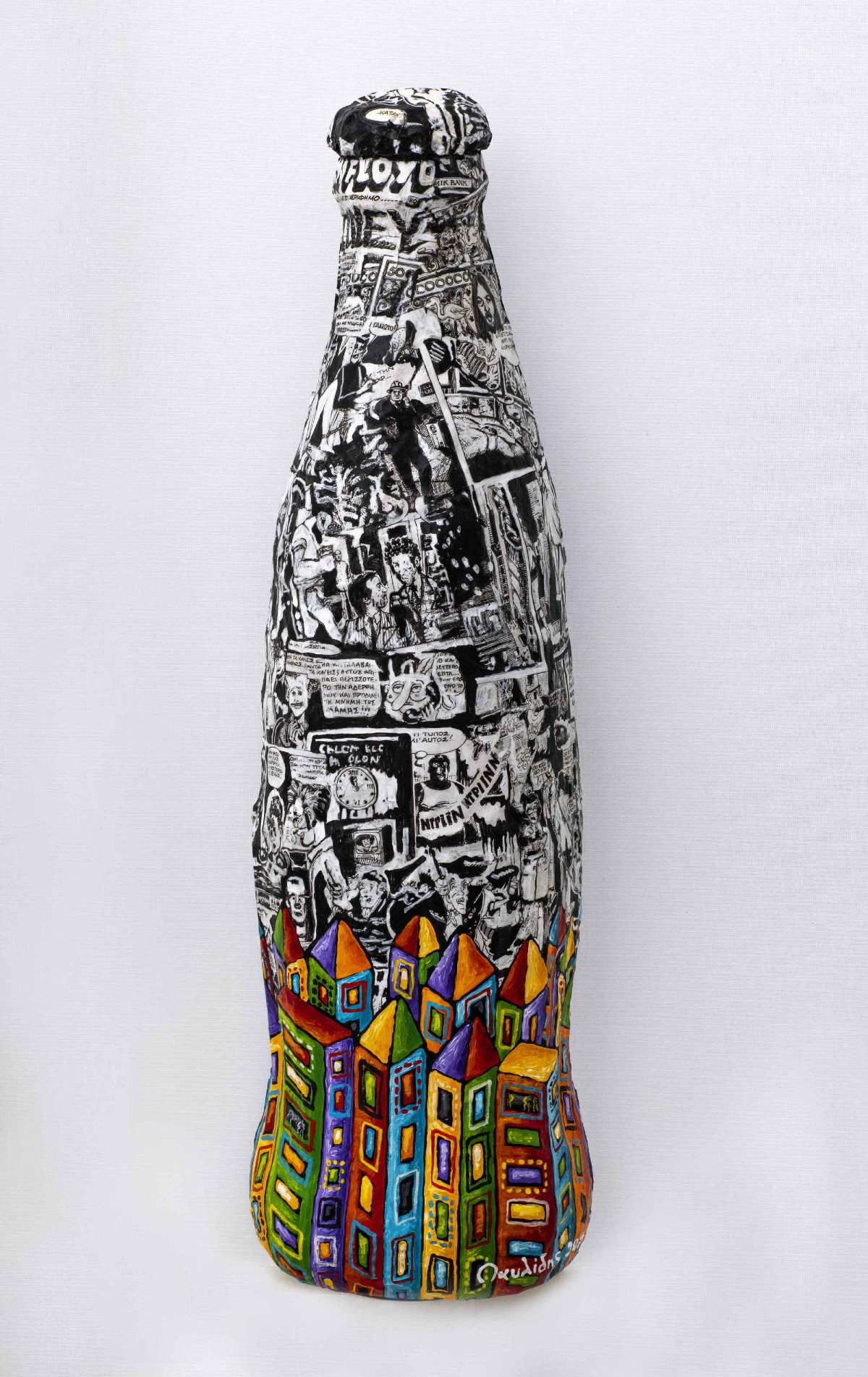 Ο Γιάννης Παυλίδης συνεπής σε αυτό που αγαπά, δημιούργησε τη νέα του δουλειά με ζωγραφικά, επιδαπέδια και επίτοιχα γλυπτά έργα χρησιμοποιώντας το papier mache σε συνδυασμό με το έντονο χρώμα από τη μία και το ασπρόμαυρο των κόμικς από την άλλη. Η συνύπαρξη από τους συνδυασμούς των έντονων και πυκνών χρωματικών αντιπαραθέσεων με το άσπρο-μαύρο των ανακατασκευασμένων-ενοποιημένων σαν μια μεγάλη ιστορία κόμικς, είναι που δίνει «ζωή» σε όλη την εγκατάσταση και σε κάθε έργο ξεχωριστά. Η αχαλίνωτη ελευθερία στη φαντασία που δημιουργούν οι ασπρόμαυροι χαρακτήρες των κόμικς με τις πολύχρωμες, πολύβουες πόλεις έρχονται και δένουν με τα τρισδιάστατα επίτοιχα, φτιαγμένα με papier mache σύμβολα των εταιρειών και των προϊόντων του σήμερα, σε ένα αισθησιακό χορό μεταξύ φανταστικού και πραγματικού.
