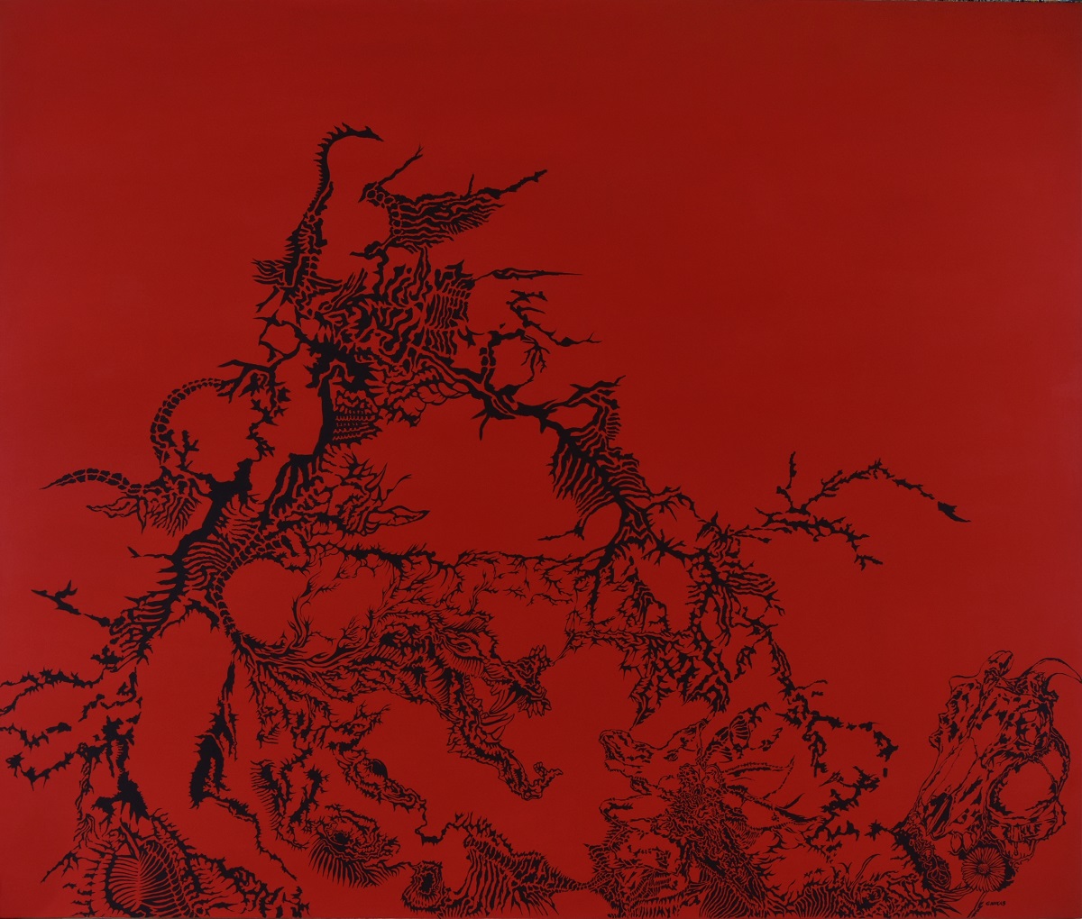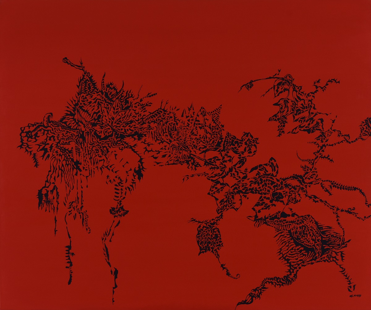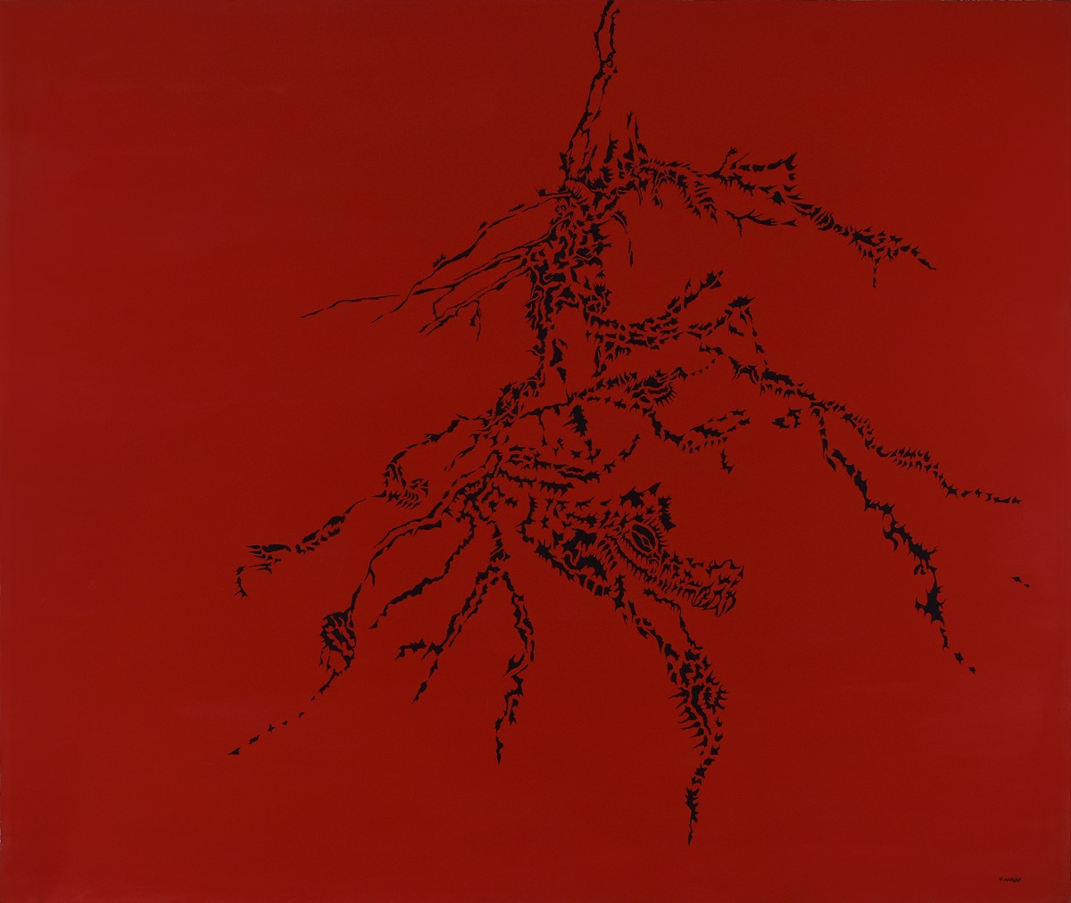 Οι συνθέσεις παραπέμπουν επίσης σ’ ένα σουρεαλιστικό ασυνείδητο ως συνειρμοί ή ακόμη ένα σύχρονο είδος άναρχου αραβουργήματος ή ταπετσαρίας και αποτυπώνονται με μια αίσθηση αχειροποίητου. Μετά από σχηματικούς και χρωματικούς πειραματισμούς κατέληξα κυρίως στη διχρωμία του ζοφερού αλλά και αρκετά φωτεινού ερυθρού καδμίου σε συνδυασμό με το μαύρο χρώμα. Το ερυθρό παραπέμπει στην ενέργεια, την αγάπη αλλά και το αίμα, τη θεία κοινωνία, τη ζωή αλλά και τη δυστοπία, τον πλούτο και την αρχαιότητα. Είναι ένα είδος ζωγραφικού – πλατωνικού ίσου όπως αντίστοιχα το χρυσό συναντάται ως φόντο – άπειρο στη Βυζαντινή Τέχνη.