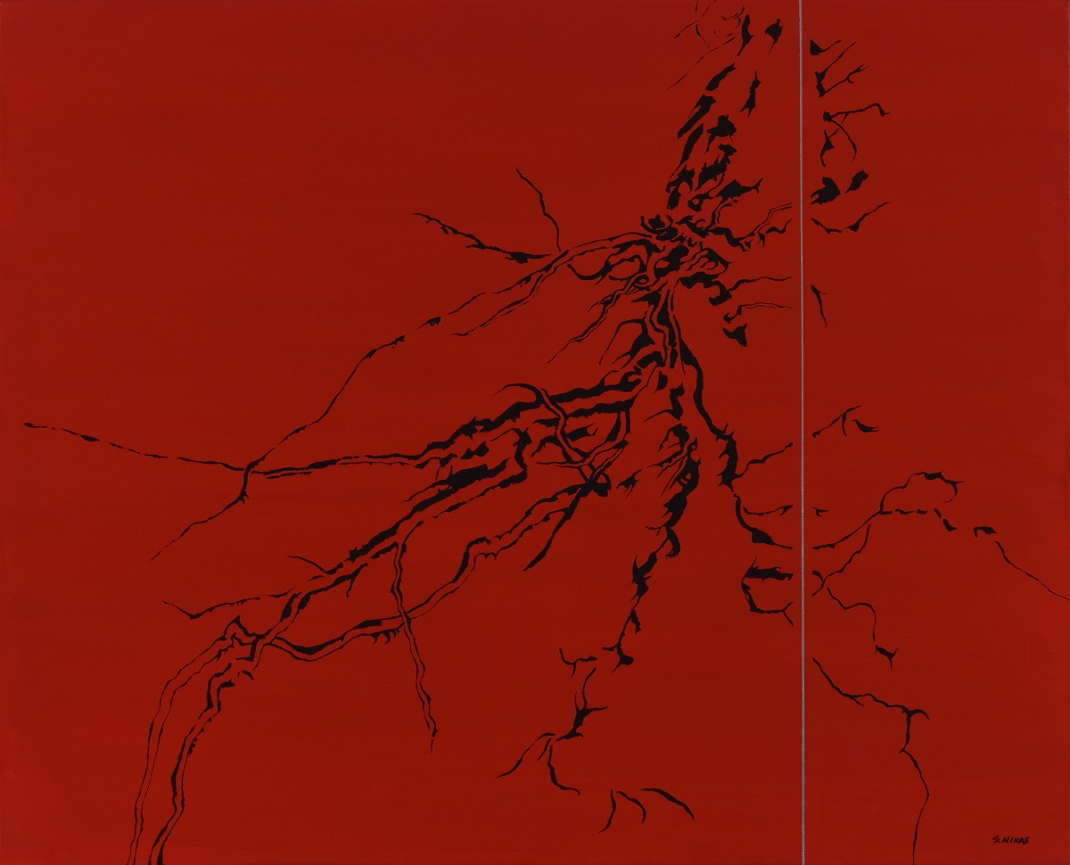 Κλαδιά, ρίζες, δέντρα και φυλλωσιές αναρριχώνται στις κόκκινες επιφάνειες σαν νευρώσεις. Καμιά φορά θυμίζουν αποστεωμένα ζώα και σπονδυλικές στήλες δεινοσαύρων σε Ρωσικό μουσείο φυσικής Ιστορίας. Σίγουρα όμως η αφοσίωση του και το υφολογικό άπλωμα στον χώρο, δημιουργεί ένα νέο τόπο αναφοράς που θυμίζει ματωμένα ποτάμια, ή αντανακλάσεις ηλιοβασιλέματος σε ήσυχα νερά, όπως τα νούφαρα του Claude Monet έγιναν φλεβώσεις σύγχρονου προβληματισμού. Σαν μια αέναη ταπετσαρία ενός φανταστικού σπηλαίου Λασκώ και με προφητεία που θυμίζει αρχαία μυθολογία, ο Γ. Νίκας κάνει αναφορά στις πλατωνική οντολογική κλίμακα. Αποτυπώνει την ιδέα να ενυπάρχει της υλοποίησης και προσπαθεί να μεταλαμπαδεύσει ακριβώς αυτά τα κρυφά νοήματα.