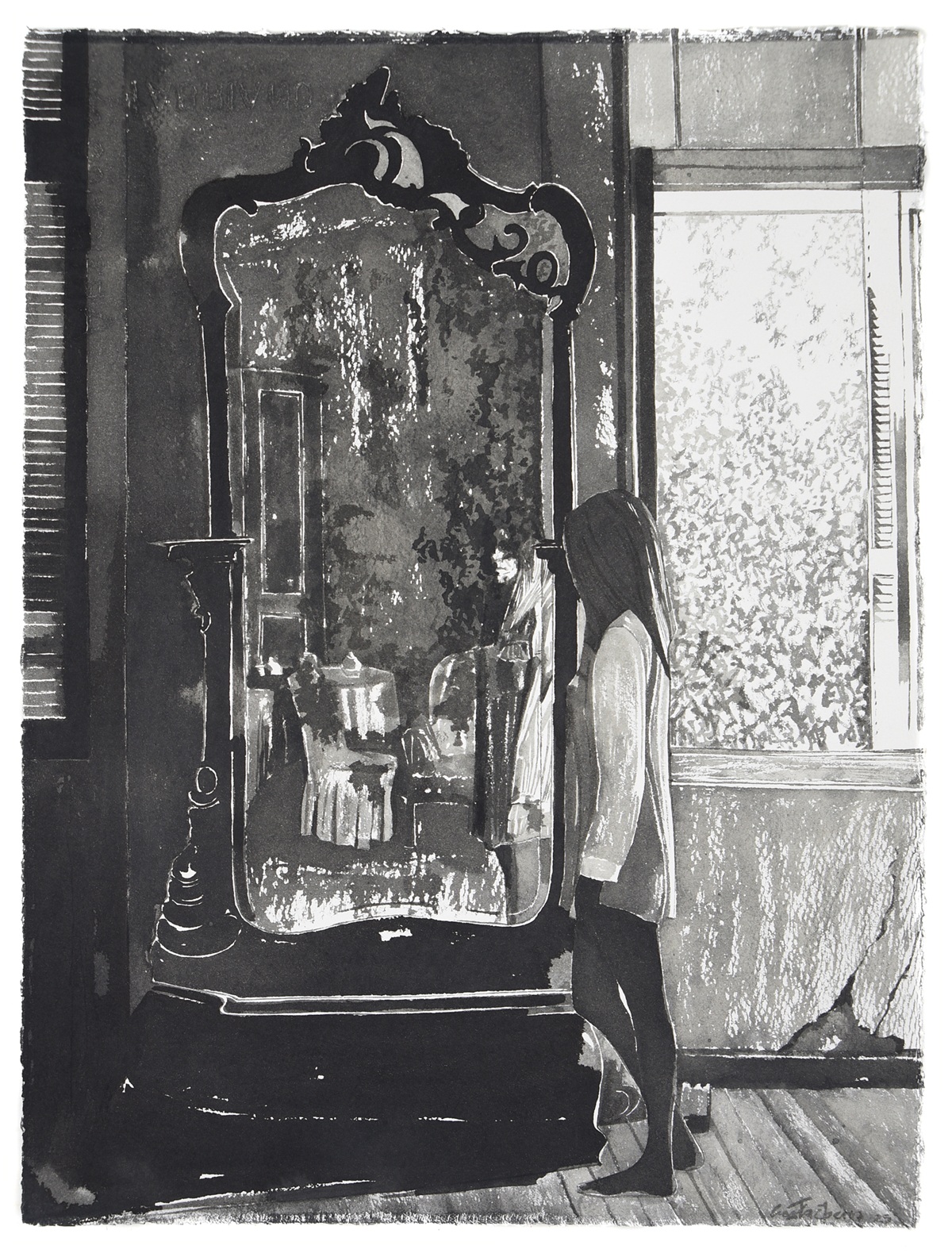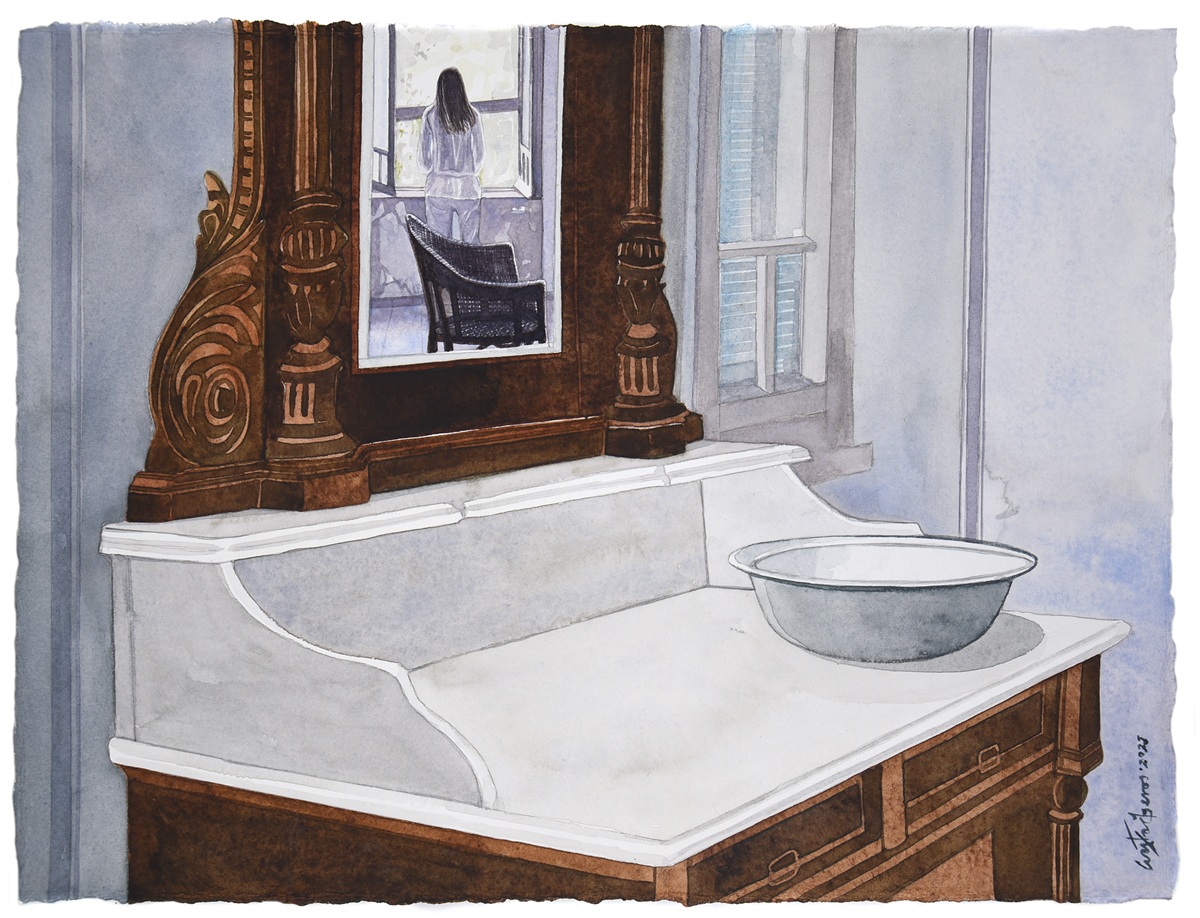 Γ.Σ. Δεν είχα υπ΄όψιν μου αυτό το έργο του Μαγκρίτ. Αλλά, όσο τρελό και αν ακούγεται, είχα σκεφτεί κάποια στιγμή να κάνω μιαν ακουαρέλα της κοπέλας που να βλέπει την πλάτη της στον καθρέφτη. Αυτό που όμως ήθελα πιο πολύ είναι να δει τον εαυτό της όπως τον βλέπω εγώ, όχι κάτι άλλο.