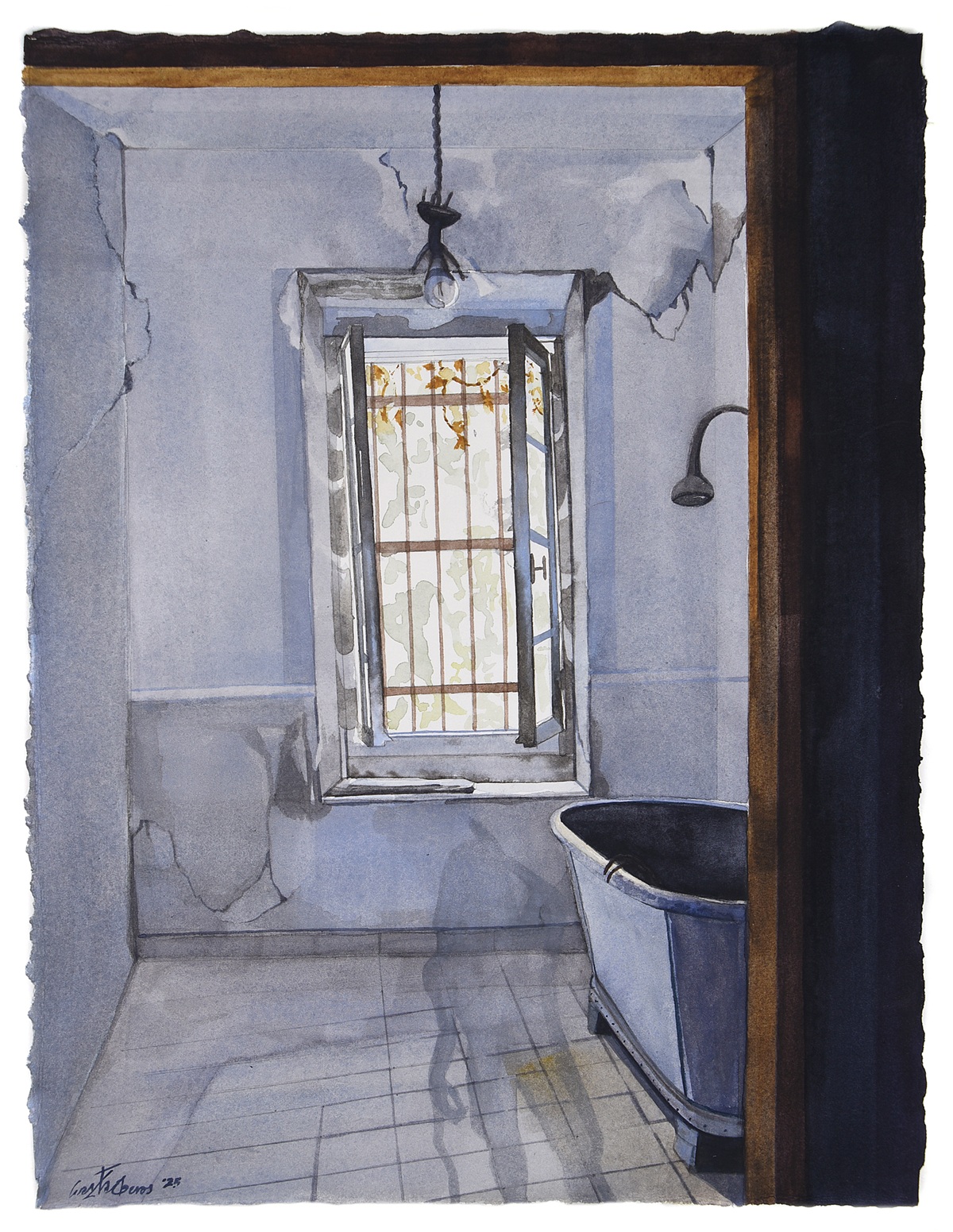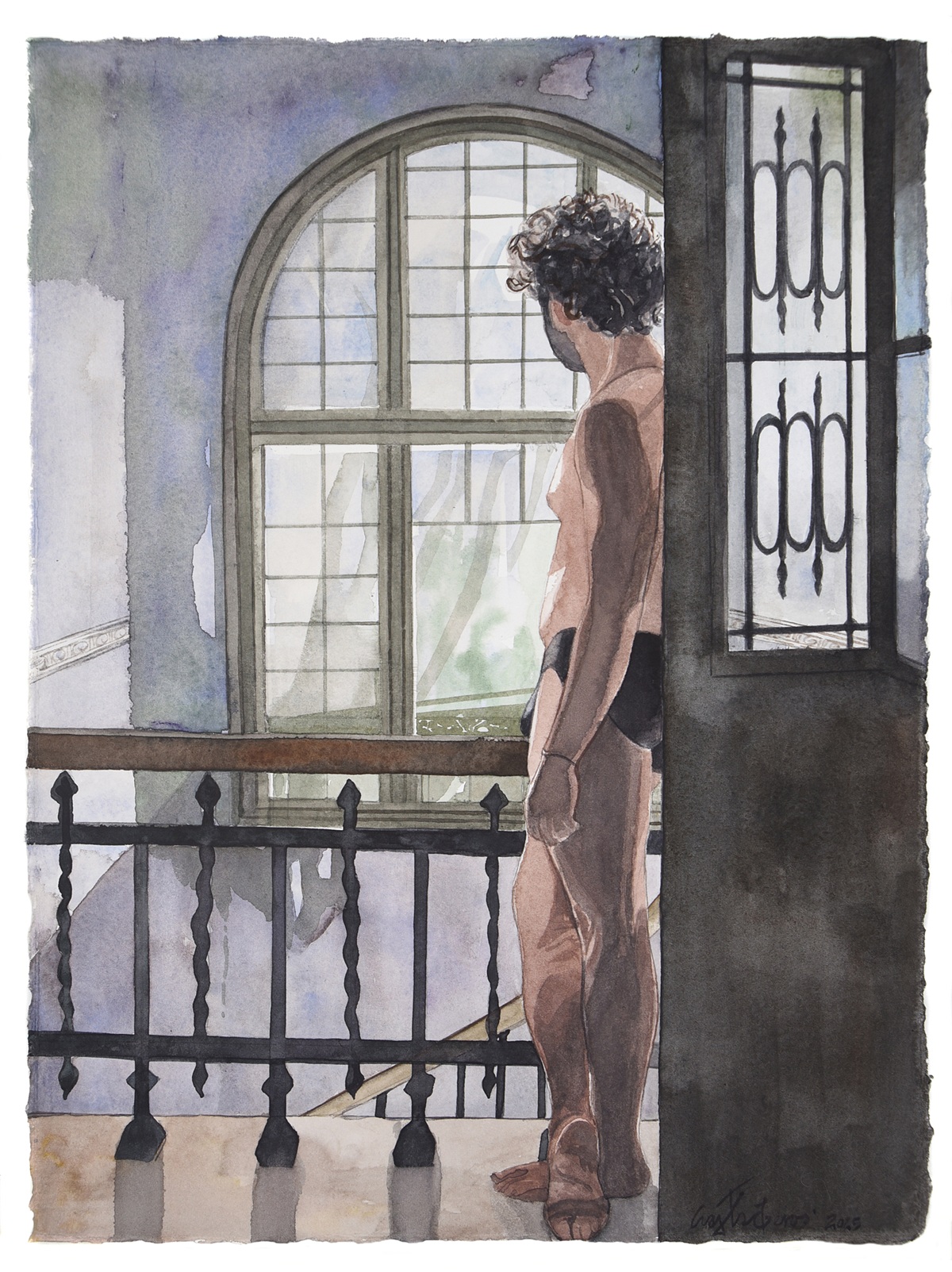 Γ.Σ. Όλες οι αντανακλάσεις μου είναι αφηγηματικές. Δεν θεωρώ ότι η τελευταία μου δουλειά είναι περισσότερο ανθρωποκεντρική αλλά η συνέχεια των αλωνιών, των αιμασιών, των κτηρίων των μεσαιωνικών πόλεων που αντιμετωπίζω με τον ίδιο τρόπο όπως τους εσωτερικούς χώρους και τους δυο ανθρώπους που αποτυπώνω εδώ. Οι εσωτερικοί χώροι με ενδιέφεραν πάντα, Ιδιαίτερα όταν βρίσκονται σε κατάσταση παρελθοντολογικής αφήγησης και δεν είναι σύγχρονοι, ενεργοί. Προσπαθώ να αφουγκρασθώ αυτά που έχουν να μου πουν. Όσον αφορά τις ανθρώπινες μορφές πρόκειται για άτομα που γνωρίζω, χωρίς να τα αναπαριστώ πιστά. Μπορεί να έχουν υπάρξει στους χώρους αυτούς και μπορεί και να μην έχουν βρεθεί ποτέ εκεί. Το ζητούμενο είναι να δημιουργήσω έναν διάλογο μεταξύ του μάρτυρα της χωρικής μνήμης καθρέφτη και του προσώπου που καθρεφτίζεται σ΄αυτόν.