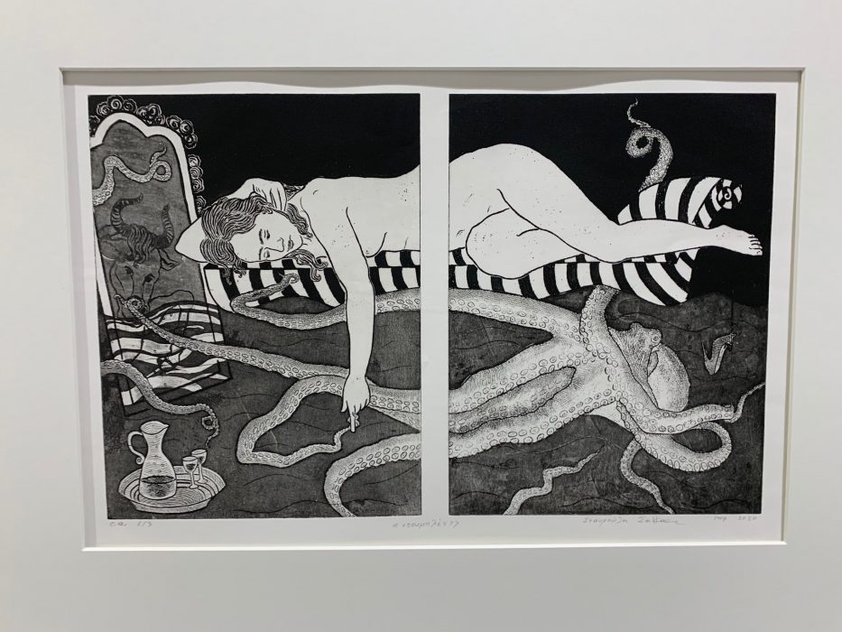 Τα ασπρόμαυρα σχέδια της Σταυρούλα Σακκά συνομιλούν κατά πρόσωπο με τον Aubrey Beardsley, ψάχνοντας την έμφυλη ταυτότητα μέσα από αρχέγονους μύθους πάνω σε μία άχρονη σκακιέρα. Η γυναίκα, ο ταύρος, το χταπόδι , αντανακλώνται στον καθρέπτη, και δημιουργούν δύο αφηγήσεις που μοιάζουν να εξηγούν και ταυτόχρονα να αντιστρέφουν τη Φρούδική λιβιδινική θεωρία.