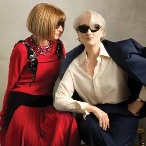 Η παγκόσμια διευθύντρια σύνταξης του περιοδικού ποζάρει στον φακό της Άνι Λίμποβιτς (Annie Leibovitz), έχοντας στο πλευρό της την Μέριλ Στριπ (Meryl Streep), η οποία άφησε εποχή ενσαρκώνοντας τη Miranda Priestly στην ταινία «Ο Διάβολος Φοράει Prada», σε ένα ρόλο που για πολλούς καθρέφτιζε την ίδια την Γουίντουρ.