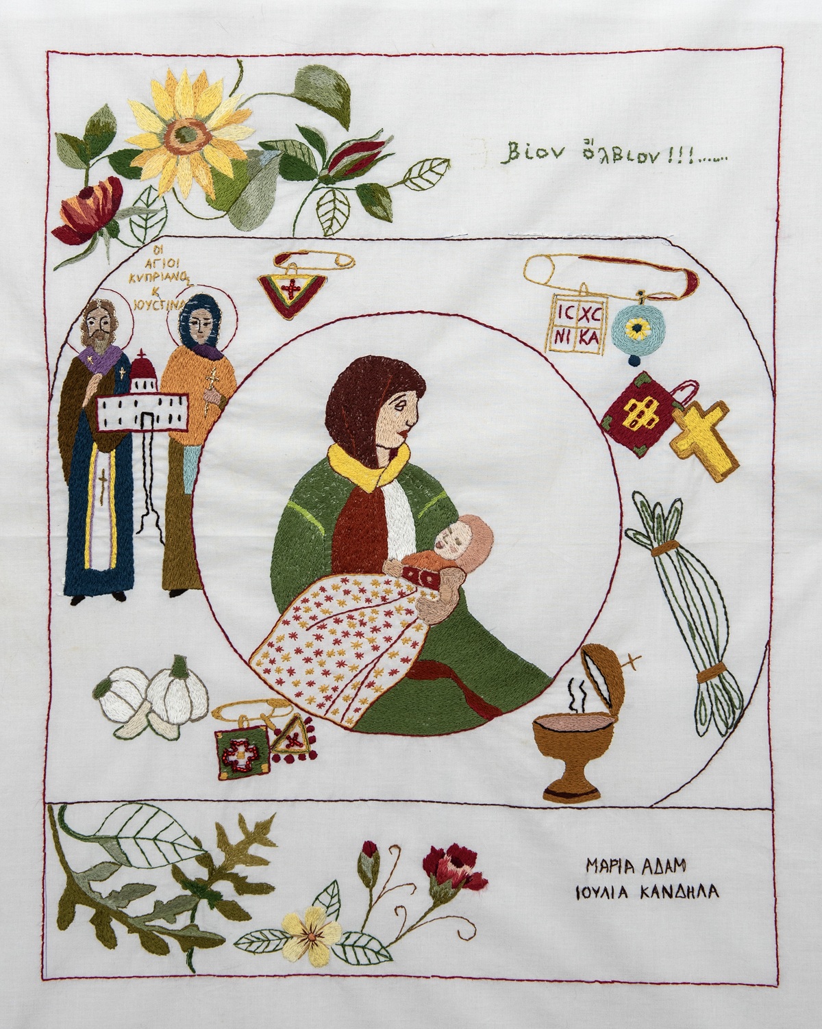 Πρόκειται για μία συλλογική έκθεση, η οποία αναπτύσσεται σε δύο διακριτές ενότητες. Στην πρώτη παρουσιάζεται ένα ενιαίο έργο λαϊκής τέχνης, με ροή και συνέχεια, το οποίο συντίθεται από δεκαοκτώ επιμέρους χειροποίητα κεντήματα, που επιμελήθηκαν γυναίκες – μέλη του Συλλόγου Εκπαιδεύσεως Νεανίδων (Σ.Ε.Ν.), ξεδιπλώνοντας σε μια εικαστική αφήγηση την εμπειρία της εγκυμοσύνης και της γέννας, όπως βιωνόταν στο πλαίσιο μιας παραδοσιακής κοινότητας.