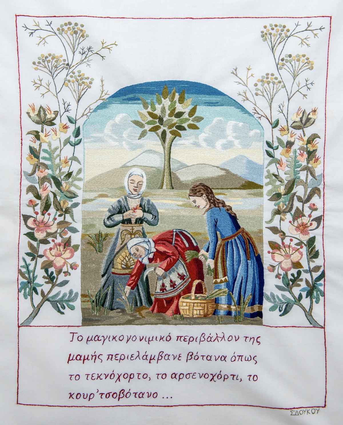 Δεκαοκτώ σύγχρονες γυναίκες κεντήστρες με την θεματική καθοδήγηση της λαογράφου Σταυρούλας Πισιμίση και τις σχεδιαστικές οδηγίες της εικαστικού Ιφιγένειας Σδούκου, πήραν στα χέρια τους κλωστές και βελόνι και πάνω σε λευκό πανί αφηγούνται ράμμα το ράμμα τα στιγμιότυπα της διαδρομής της γυναίκας από την προσμονή και τις δοξασίες της εγκυμοσύνης, τα σπάργανα και τα φυλαχτά, έως την γέννηση και τα πρώτα βήματα της μητρότητας, αλλά και τις πράξεις μύησης και ευλογίας του νέου μέλους στην κοινότητα έως την θέση της γυναίκας στον κύκλο της ζωής. Μέσα από τα νήματα αποτυπώνονται οι προλήψεις και οι τελετουργίες μιας κοινότητας, που προσπαθεί να εξηγήσει το ανεξήγητο, να προστατεύσει το εύθραυστο, να μεταδώσει τη ζωή.