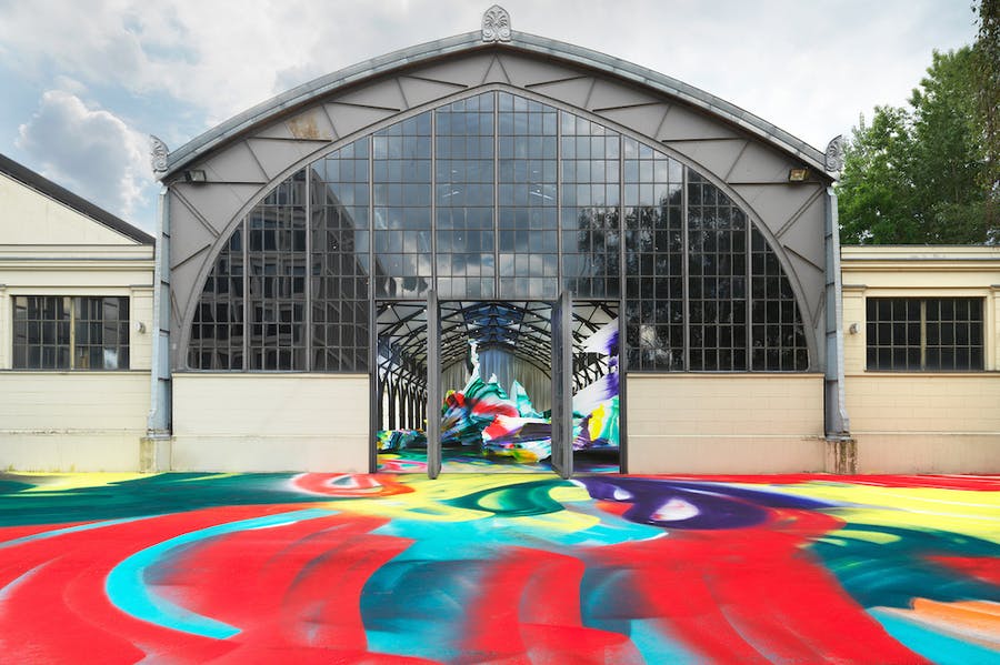 Ένα έργο της Katharina Grosse μπορεί να εμφανιστεί οπουδήποτε. Τα μεγάλης κλίμακας έργα της είναι πολυδιάστατοι εικονογραφικοί κόσμοι στους οποίους υπέροχα χρώματα σαρώνουν τοίχους, οροφές, αντικείμενα, ακόμη και ολόκληρα κτίρια και τοπία. Φέτος το καλοκαίρι, η καλλιτέχνης μετέτρεψε την ιστορική αίθουσα του Μουσείου Hamburger Bahnhof, καθώς και τον υπαίθριο χώρο του, σε έναν εκτεταμένο πίνακα ζωγραφικής που αποσταθεροποιεί ριζικά την υπάρχουσα τάξη της αρχιτεκτονικής του μουσείου.