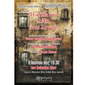 H «Άνεμος εκδοτική» και η Κωνσταντία Γέροντα, σας προσκαλούν στην παρουσίαση της πρώτης ποιητικής της συλλογής, με τίτλο «Η κάθε του λέξη ένας λυγμός».