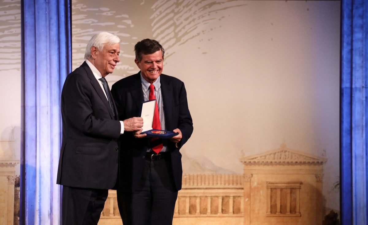 Αντιθέτως η δημόσια παρουσία τους ταυτίζεται με τη σεμνότητα και τη διακριτικότητα. Αποφασίσαμε να τιμήσουμε σήμερα τον κ. Αθανάσιο Μαρτίνο, γιατί αποδεικνύει ότι η έγνοια για την πατρίδα παραμένει ζωντανή και στη δική μας εποχή», υπογράμμισε η Πρόεδρος προσθέτοντας πως ένα από τα πρόσφατα κοινωφελή έργα του βραβευθέντος και της συζύγου του, κυρίας Μαρίνας Μαρτίνου, ήταν και η ανακαίνιση της παιδικής χαράς του Ζαππείου.