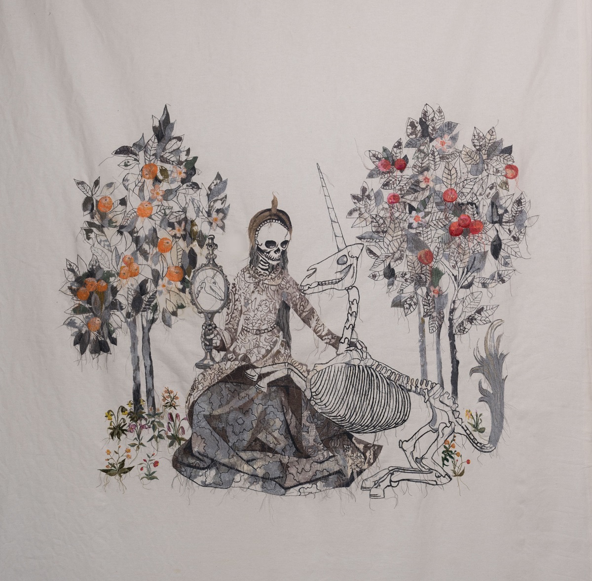 Στη δουλειά της Ιφιγένειας Σδούκου η παραδοσιακή τεχνική του κεντήματος αναδεικνύεται σε σύγχρονο εικαστικό μέσο. Μυθικά πλάσματα, Κένταυροι, αναγεννησιακές γυναίκες, παγώνια, κοράκια, μονόκεροι, ιππότες, νεκροκεφαλές κ.ά. συνθέτουν τον μυθικό, ρομαντικό και γοητευτικό κόσμο της Σδούκου.