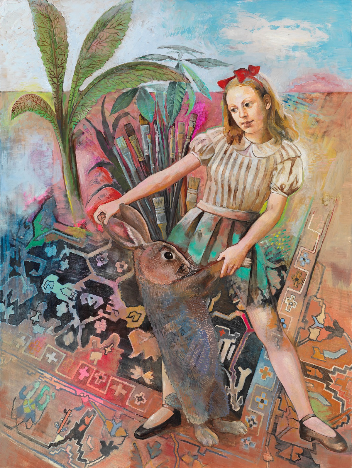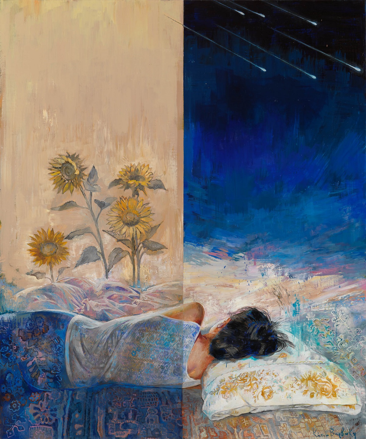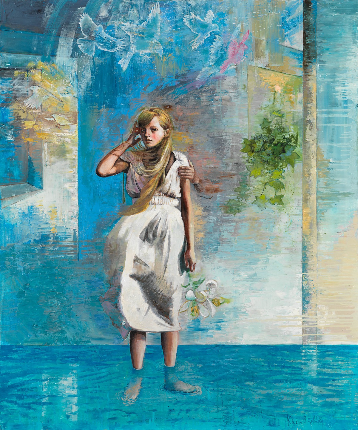 Στα έργα της ζωγράφου εικονίζονται παιδιά που δεν θέλουν να μεγαλώσουν, ενήλικες που θα ήθελαν να ξαναγίνουν παιδιά. Μικρά ενορχηστρωμένα θαύματα συντελούνται πίσω από γυάλινους διάφανους τοίχους, δέντρα μπλε θροΐζουν σε κάμπους άγνωστους, ένας μικρούλης κουρασμένος δράκος αποκοιμιέται τρυφερά και μια Αλίκη μας καλεί σε νέα χώρα θαυμάτων. Στα διάστικτα ετούτα από πυκνά επεισόδια παλίμψηστα πεδία με τα μαγικά ιπτάμενα χαλιά-κήπους, τις ευρηματικές καλειδοσκοπικές διαφάνειες και τα τολμηρά αιωρούμενα χρώματα που συνδέονται με επίπονα επάλληλα σχεδιάσματα, εκτοξεύοντας μωβ, γαλανούς και ρόδινους παφλασμούς εναιωρούμενης ύλης, συναντούμε και γευόμαστε απαλά την άλλη διάσταση των πραγμάτων. Το πέρασμα σε ένα λιβάδι ονείρων, κεντημένο με άγνωστα παραμύθια, μυστικούς γρίφους και χειροποίητα παιδικά αθύρματα, σπαρμένο με λεπτή σκόνη εξαίσιας δαντελωτής μνήμης και συντελεσμένου μα ωσεί παρόντος χρόνου.