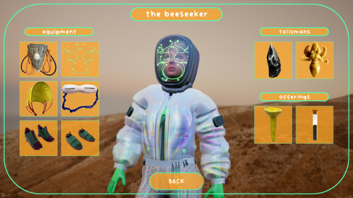 Στο παρόν στάδιο, το παιχνίδι βρίσκεται σε αρχική φάση με την παρουσίαση της Beeseeker, η οποία λειτουργεί ως οδηγός και άβαταρ του παίκτη, ενώ o εξοπλισμός της δίνει τα πρώτα στοιχεία για το αρχιπέλαγος και την αφήγηση του βιντεοπαιχνιδιού. Οι επισκέπτες καλούνται να εξερευνήσουν τα εργαλεία, τα φυλαχτά και τις προσφορές της, αντικείμενα εμποτισμένα με ιστορία, δράση και συναισθηματική σημασία. Αυτά περιλαμβάνουν σπόρους αγριολούλουδων που προορίζονται για φύτευση, δοχεία για νερό για την ενυδάτωση των μελισσών, δράσεις όπως το βουητό ή η εκτέλεση του χορού των μελισσών ως μέσο επικοινωνίας με τη μη ανθρώπινη ζωή. Με αυτόν τον τρόπο, η αλληλεπίδραση στον κόσμο του παιχνιδιού πραγματοποιείται μέσω της παρατήρησης και της φροντίδας αντί της επέκτασης ή της κατάκτησης.
