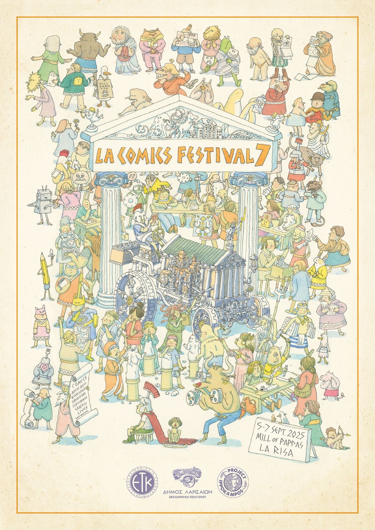 Το LAComicsFestival επιστρέφει για 7η συνεχή χρονιά, μετατρέποντας τη Λάρισα σε σημείο συνάντησης της σύγχρονης underground εικονογραφικής -και όχι μόνο- δημιουργίας! Από τις 5 έως τις 7 Σεπτεμβρίου 2025, ο Μύλος του Παππά θα φιλοξενήσει ένα τριήμερο αφιερωμένο στις τέχνες των comics, της εικονογράφησης, τη μεταξοτυπίας, του animation, της μουσικής και της street art, πάντα με ελεύθερη είσοδο σε όλες τις δράσεις του. Το επίσημο εικαστικό σχεδίασε ο καλεσμένος του Φεστιβάλ, Σουηδός εικονογράφος Mattias Adolfsson.