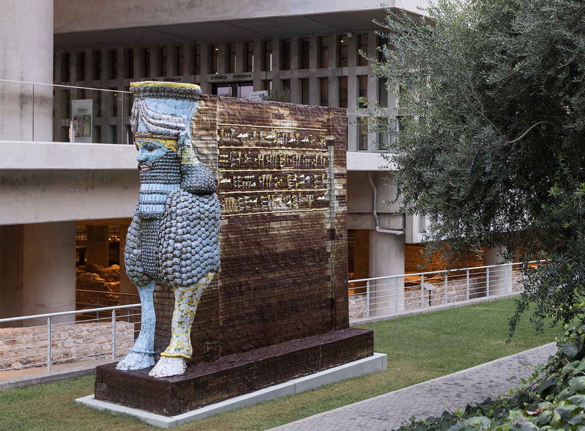 Κεντρική φωτογραφία θέματος: Michael Rakowitz, The Invisible Enemy Should Not Exist (Lamassu of Nineveh), 2018, 10,500 κονσέρβες ιρακινού σιροπιού χουρμά, μεταλλικό πλαίσιο, 4.69 x 1.70 x 4.48 μ., Έργο κατ’ ανάθεση για το πρόγραμμα Fourth Plinth του Δημάρχου Λονδίνου, Ευγενική παραχώρηση ο καλλιτέχνης και ο Δήμαρχος Λονδίνου | Installation view Lamassu of Nineveh (2018) | Michael Rakowitz & Ancient Cultures, 2025 | Συνεργασία NEON + Μουσείο Ακρόπολης | Φωτογραφία © Ναταλία Τσουκαλά | Ευγενική παραχώρηση ΝΕΟΝ, Μουσείο Ακρόπολης και ο καλλιτέχνης