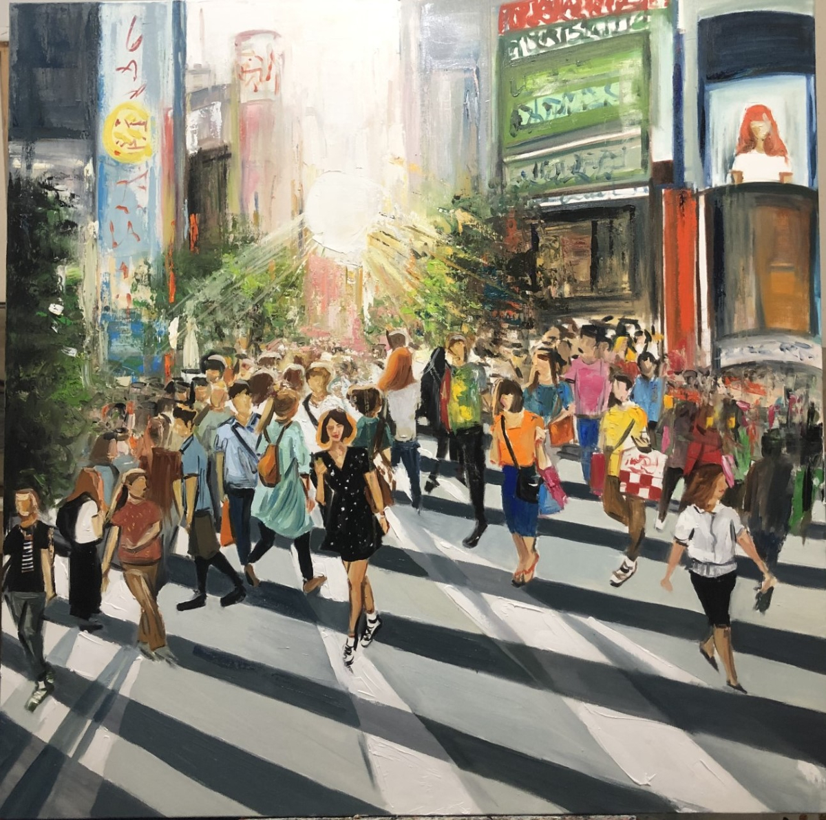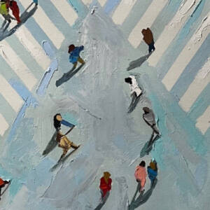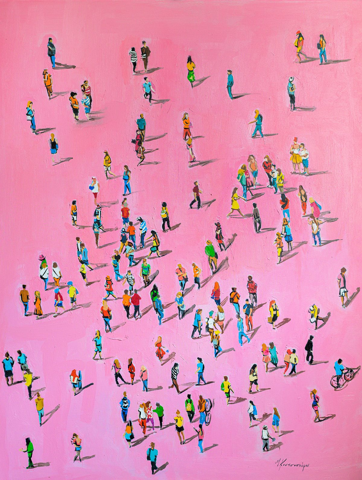 Αστικά περιβάλλοντα εμφανώς αναγνωρίσιμα, με τις κεντρικές, πλατιές λεωφόρους τους -στην σκέψη πολύβουες-, σημείο κατατεθέν της καθημερινής ανθρώπινης συνθήκης των σύγχρονων μεγαλουπόλεων, από ψηλά ιδωμένες, με τις γεωμετρικά αποδομένες τους διαβάσεις, οριζόντια, κάθετα ή διαγώνια, χωρίς όμως αυτοκίνητα, αλλά πολύ περπατημένες και περιδιαβούμενες από γυναίκες, άνδρες και παιδιά σε μονάδες, δυάδες ή τριάδες και πάνω. Ανθρώπινες φιγούρες μικροσκοπικές, μορφολογικά απλοποιημένες και διακριτά ξεχωριστές, αποτυπώνονται σε κίνηση καθώς προβαίνουν στον βηματισμό τους, ακολουθούμενοι συχνά από την σκιά τους, έχοντας στόχο ο καθένας τον δικό του προορισμό.